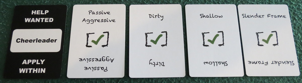 See, each round casts one player as the “employer.” He flips over a card to reveal the job he’s trying to fill. For example, right this instant I flipped over “Gym Teacher.” Then each player gets a hand of qualifications. You might be someone with skills like S&M, Jacked Forearms, Australian Accent, Mind Reader, and Pyromaniac. Or maybe Steroids, Scissors, Really Bad Aim, Hallucinates, and Oedipus Complex. You’re given a moment to “build your resume,” swapping out your worst cards for a few of the freebies in the middle of the table, and then it’s time to hold your interview.