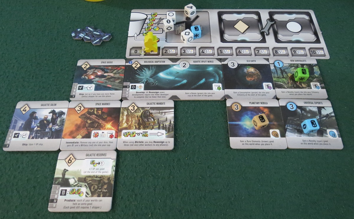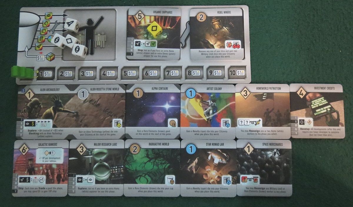 And what tableaus they are! Exploring gives you tiles, drawn from a hefty bag, each with a development on one side and a world on the other. In general, worlds provide specialized dice, ranging from lowly novelties and rare elements for trade and construction to wildcard-abundant genes and alien technology dice. Developments, on the other hand, offer an wide range of special abilities. Quite a few allow you to reassign workers, thus ignoring the whims of chance altogether, and others beef up particular phases with discounts, bonus income, or even new ways to pick up victory points.