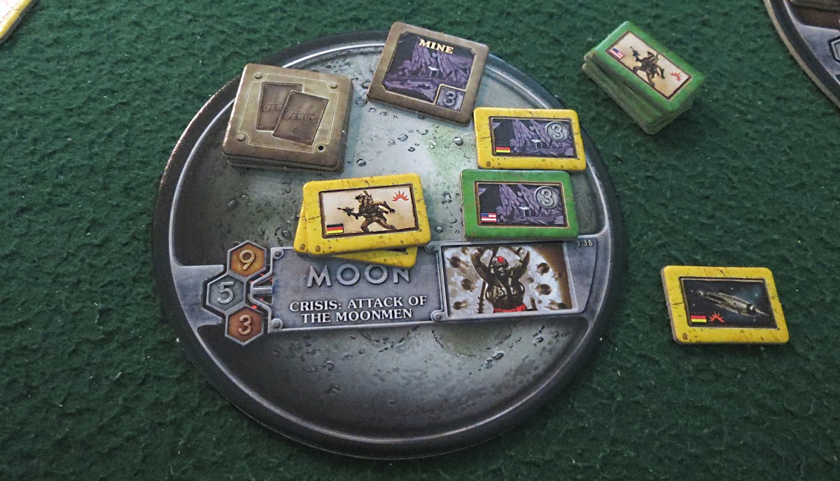 Ah, the factories! These are the launchpads of your expansion, as easy to claim as sending a single company of soldiers down to the planet’s surface and the only places other than Earth that let you build your better troops. And better troops you shall need, the ultra-heavy tanks that demolish defenses but can’t move without the aid of a special card and the rocket ships that ferry everyone from place to place. Without these, your expansion will stall, sputtering with a brassy clank as your rival nations seize territory all around you. Factories therefore tend to be hotly contested in a blitz to draw early borders, dotted lines that flimsily demarcate what’s yours.