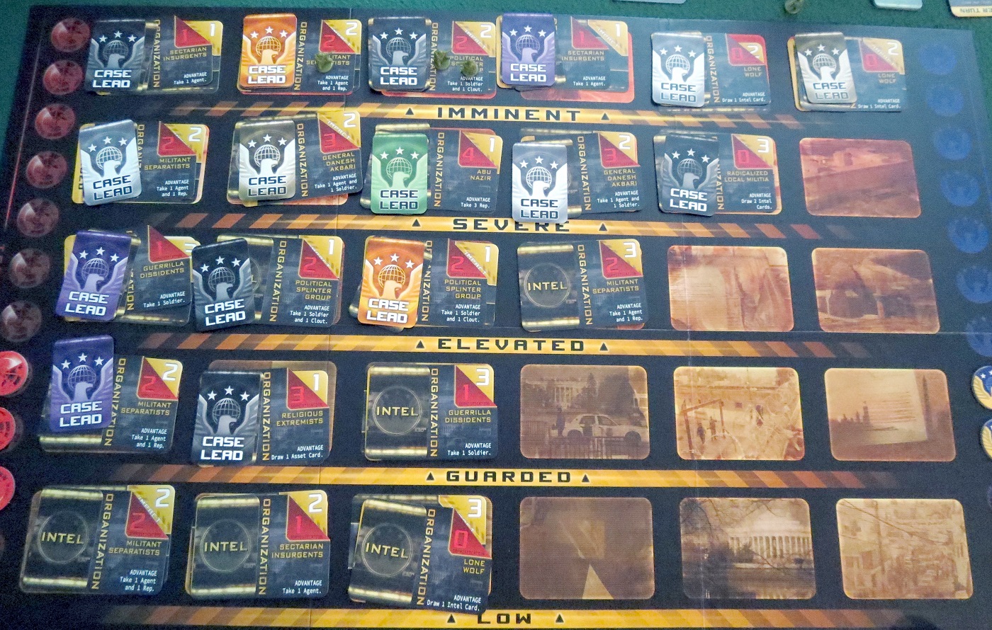 The setting, simply put, is a CIA conference room, and its players are analysts tasked with keeping America safe. The centerpiece is a board of reported terrorist activities, and onto this board you’ll pin ongoing threats. For maximum uncertainty and discomfort, these are cleverly assembled from a combination of terrorist organizations and their plots. Sometimes you’ll know that General Danesh Akbari, runner-up at the annual terrorist-of-the-year gala, is up to something, while at other times a bumbling Lone Wolf has been placing threatening phone calls. However, you can’t be sure what — specifically — they’re up to. One might be attempting to bribe a military advisor while the other tries to assassinate the vice president. One of these is significantly easier to prevent than the other, just as the unaided Lone Wolf is easier to stop than General Akbari’s entire network. Learning which terrorists are pursuing which plots tells you how difficult that plot will be to clear.