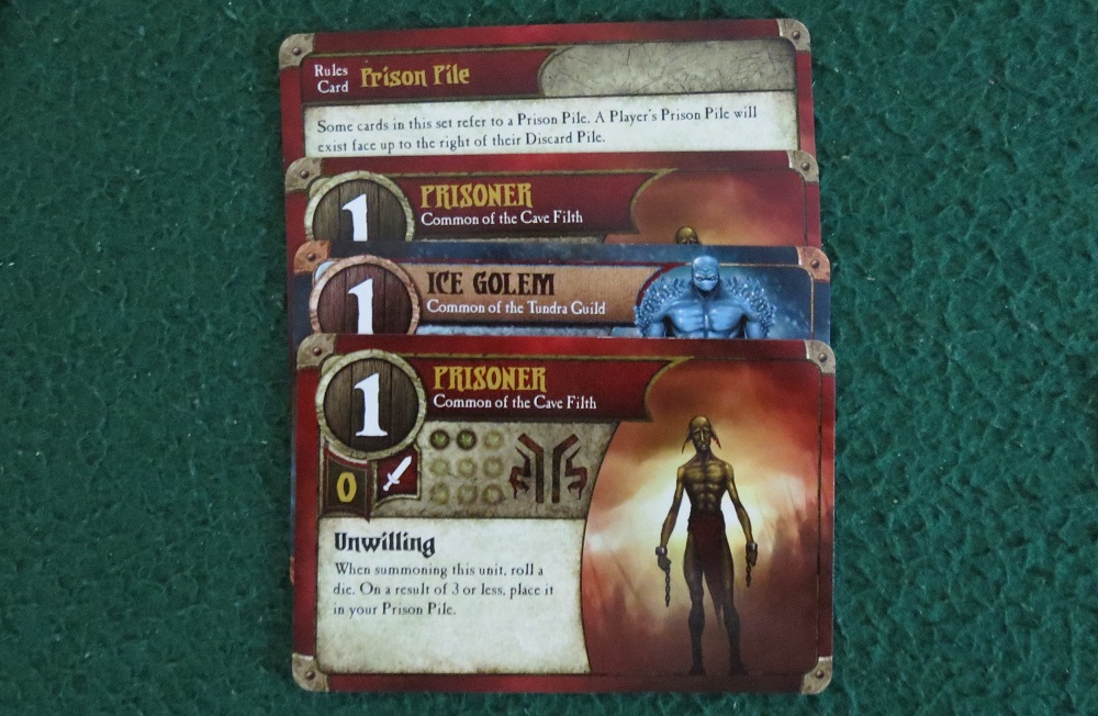 The Cave Filth are another matter. Somerset isn’t too pleased with the starting lineup for her summoner (The Warden), consisting of three Prisoners and one Taskmaster. The Prisoners cost nothing to summon but come saddled with the disadvantage that they might not be willing to fight for their captor, in which case they’re sent to the Warden’s Prison Pile. The Taskmaster can spur other common units into moving and attacking, though his lash makes them easier to kill. Neither of these are particularly impressive, though it’s the Filth’s mutations that make the faction work. For those who don’t know, mutations can be placed atop regular common units, transforming them into killing machines with a wide range of possible abilities. Success for the Filth revolves around how well they mutate their troops, so a few wimpy Prisoners are less a wimpy start and more a powerful blank slate upon which to compose your bloody symphony.