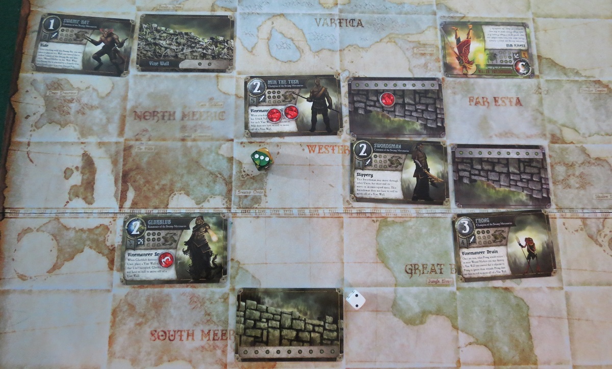 A surplus of magic is a good thing, especially when it lets me summon my first champion so early. Mik the Tusk, the only Irishorc in the entire army, comes out to play. Then I decide to continue with this unwarranted aggression, pushing him, my Swordsman, and Glurblub forward in hopes of using my summoner’s ability to get a new Vine Wall on Somerset’s side of the board. Mik gets better at attacking when he’s near Vine Walls, but this plan flubs dramatically when Glurblub’s shot fails to connect with the wounded Warrior. Still, Mik manages to lay the flaming remains of our deceased Swamp Rat pal to rest. As it dies (again), the Burning Skeleton’s ability triggers, meaning I don’t get his corpse as magic, though at least I don’t have any leftover magic for him to burn.