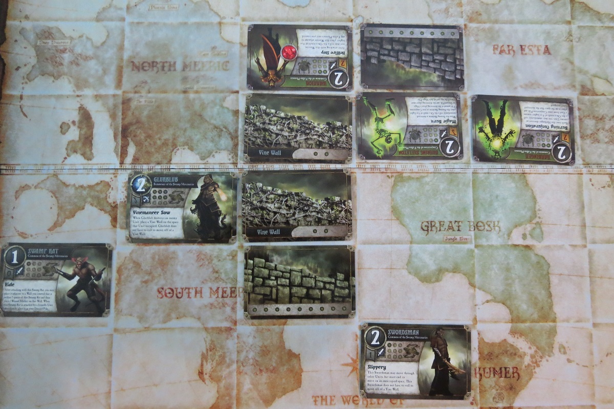 My next course of action is carefully considered. I don’t want to surrender the center, especially so early in the game. While it often makes sense to bide time behind your Walls and build magic, two factors make me want to play a little more aggressively this early on. First, I can’t kill my own Swamp Rats for magic; and second, I very much want summoning spots on Somerset’s side of the board. Immortal Elien is relatively fragile, and being able to summon nearby could give me the win. So I decide to take a risk by bringing out another Swamp Rat, then casting Spore Carriers to transform both my newly-spawned Swamp Rat and my injured Boarboon into Vine Walls.