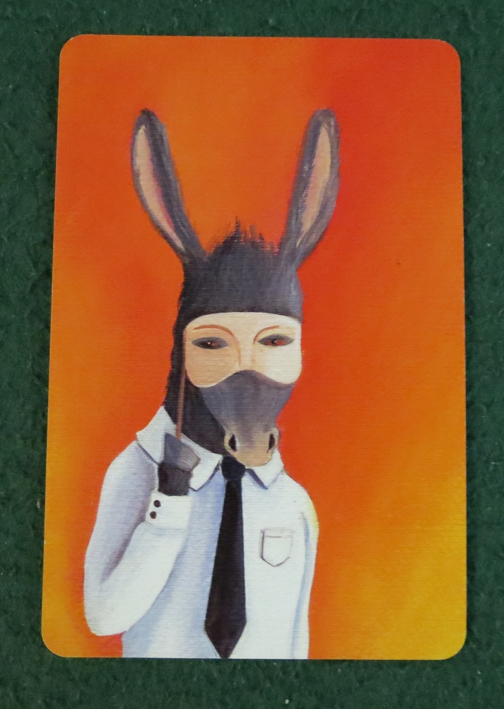 Well, I was holding the perfect card. Somerset was sitting to my right, and she was sure to get it. So I laid it down, a donkey in white shirt and tie, holding a human mask over his face, and said, “Nein wohlständig nude.”