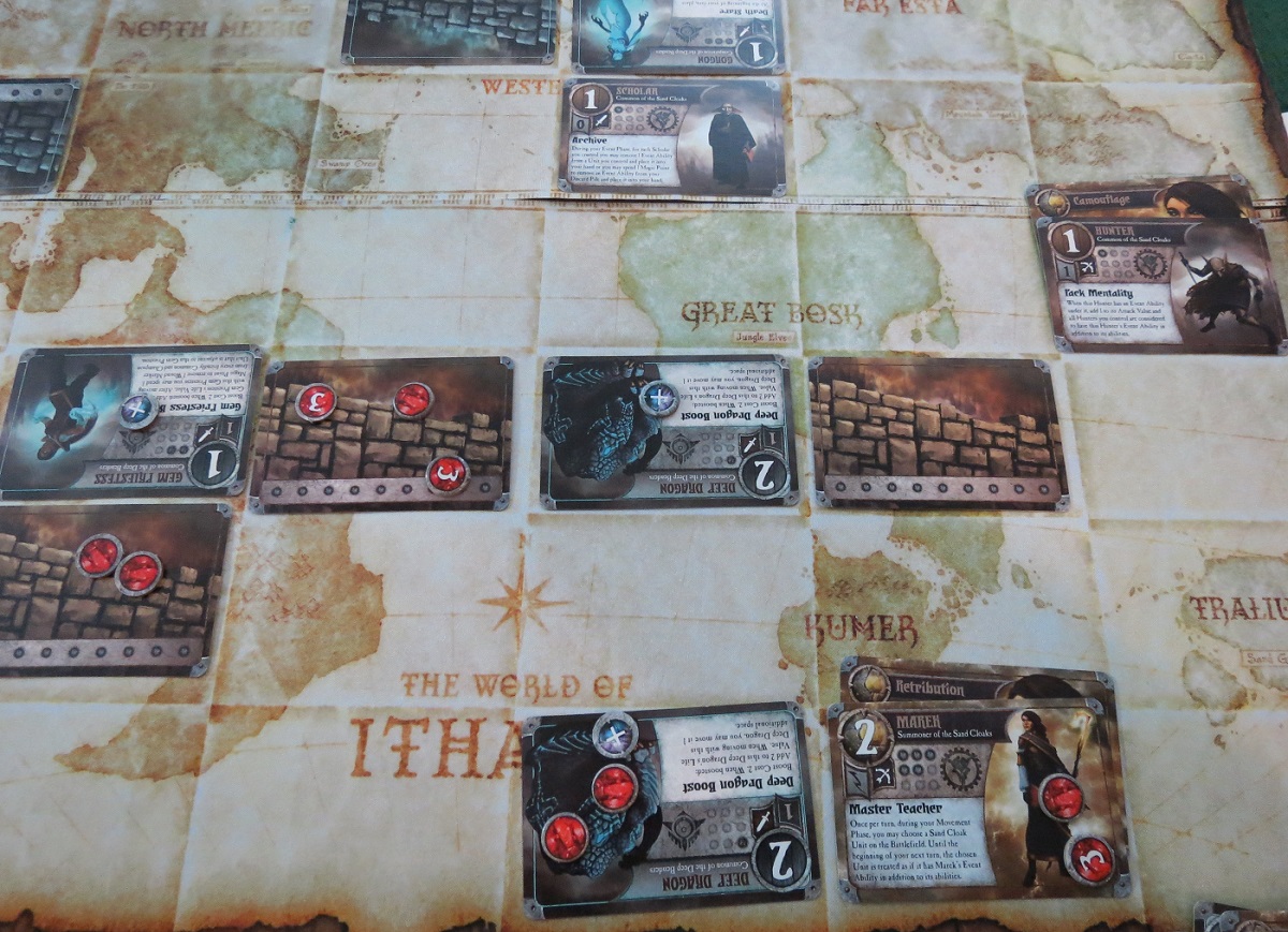 See, the Deep Benders are not only the best-stretched army in Itharia. They’re also able to “boost” themselves, paying extra when summoned to go from no ability at all to an overwhelmingly powerful ability. In this case, Unlock lets her boost two of her units, the far-northern Gem Priestess and Geopath. The former becomes tougher, but it’s the Geopath’s ability that really frightens me: plus one to his attack and he can attack enemies five spaces away. Which means that a move of a single space puts him within striking distance of the squishy Scholars on my back row.