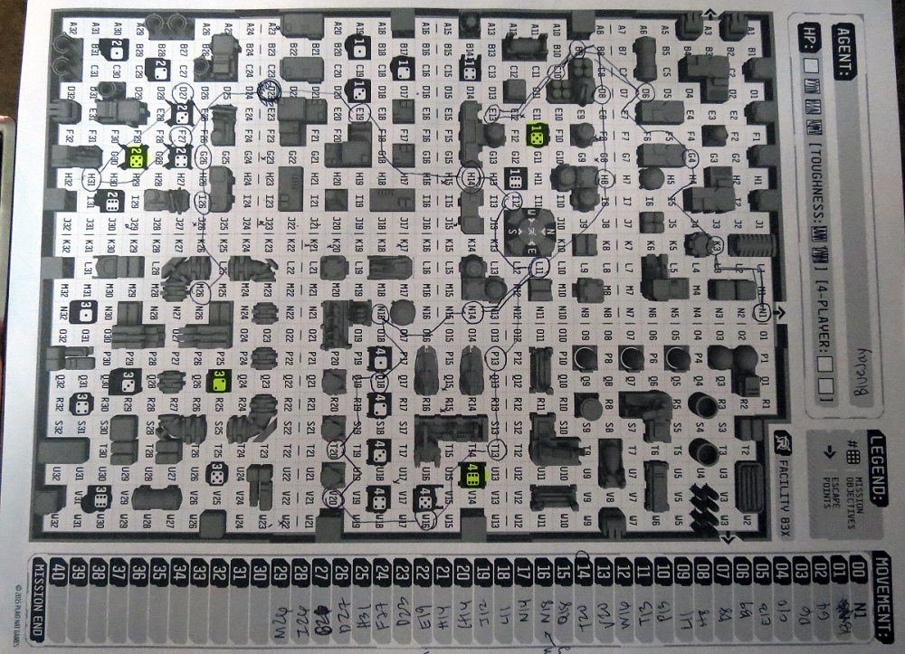 The thing, however, is that this is a deceptively simple game. Most rounds play out with the Agent moving up to four spaces, announcing she’s clear or placing a “last seen” token if she moved past her enemies, and noting where she stopped on her pad of paper. Then the Hunters get to move up to four spaces each, only spotting the Agent if they have a direct line of sight on her when they’ve come to a stop.
