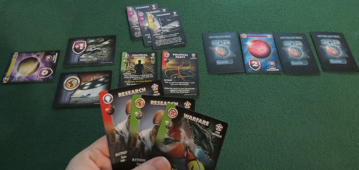 There are plenty of subtleties at play, but I’ll just give one example. Two of the main card types are Colonize and Warfare, both of which let you take control of the planets sitting in the center of the table. The Colonize card lets you take those planets for yourself, and revealing certain icons, whether from your hand or your colonized worlds, lets you take better planets.