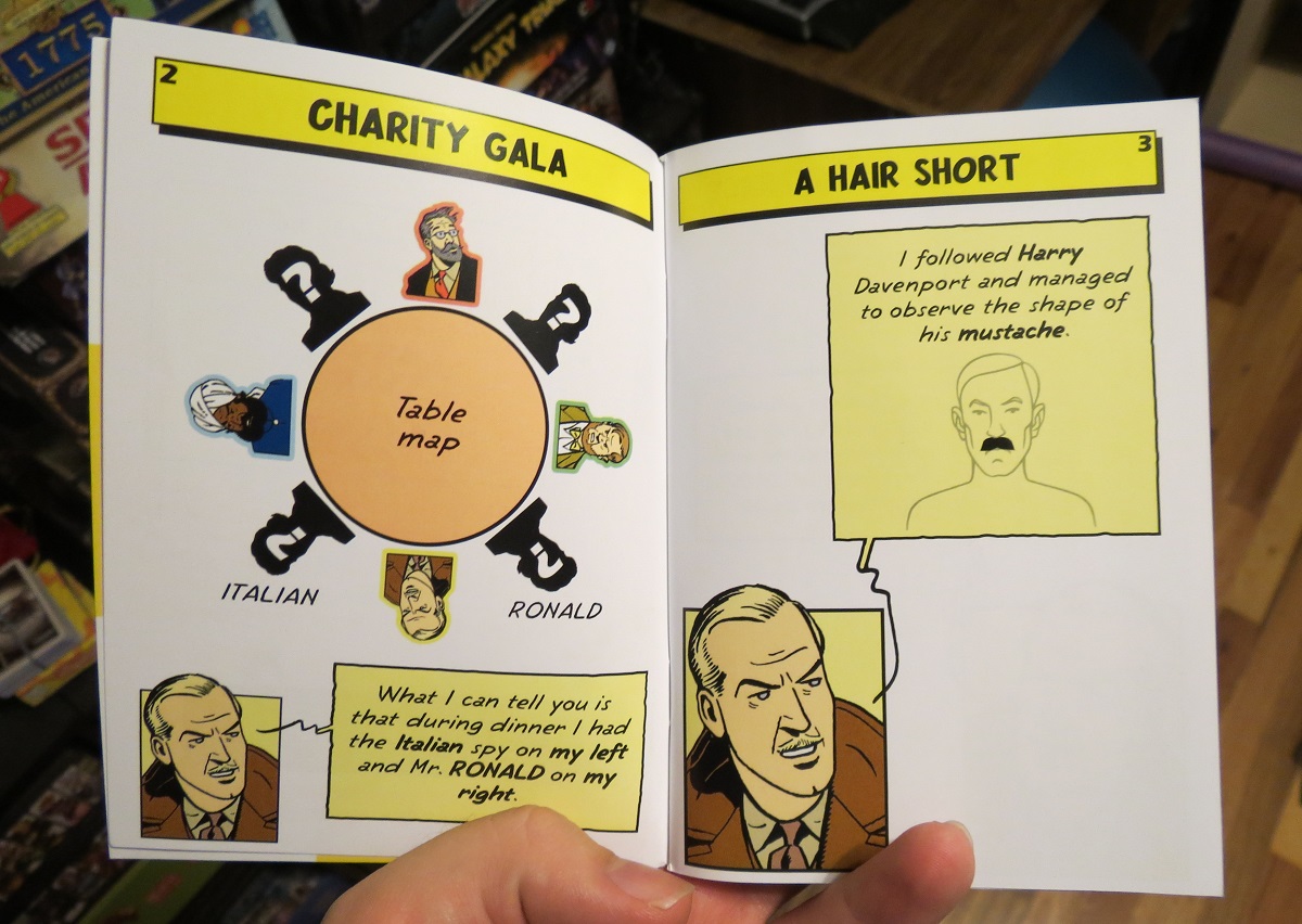 But this is where it gets tricky. See, each of the game’s four players — there must always be exactly four — now cracks open their very own booklet of clues. Within they’ll find a single piece of information. Sometimes two. And alone, these bits, these clues, are absolutely worthless. You’ll stare down at your meager crumb of info, then squint at it, then wonder why on earth it matters that you found a domino on the millionaire’s table.