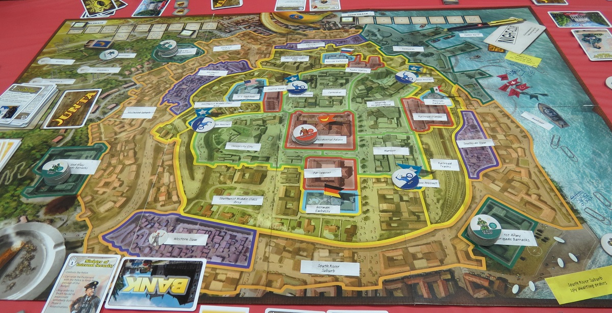 On the other hand, there’s the upside that sitting down for a three-hour game of Junta doesn’t make you feel guilty about missing out on a hundred other opportunities. You can sit and connive and lie, occasionally turning in your seat to gaze wistfully at that one event you were thinking of maybe going to, and there you’ll see about a billion people writhing in a hamburger-like mass. The sigh you’ll release can only be described as contented.