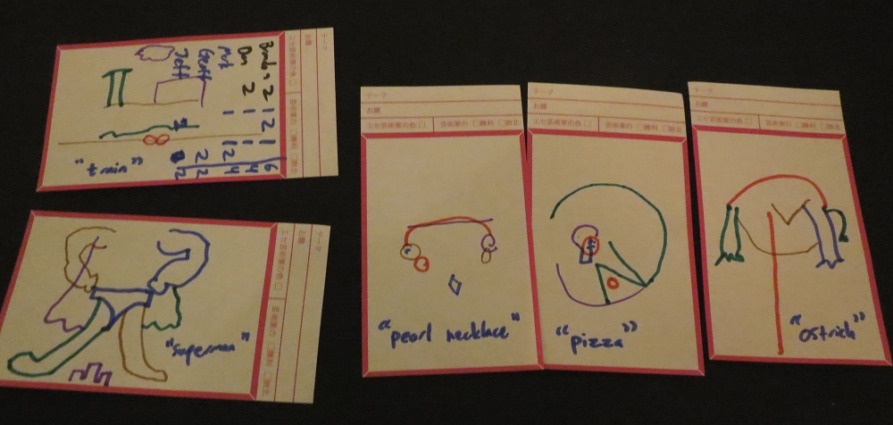 Describing A Fake Artist Goes to New York is uncannily like describing Spyfall. There’s a Question Master — who we call the “Curator,” since “Question Master” feels like a peccadillo of the game’s translation from Japanese — and everybody else at the table hands him their dry-erase boards, these cuter-than-your-beautiful-newborn-daughter objects that will make you tear up with joy when you see them. On each of these boards the Curator writes out what work of art he plans to commission. A honey badger, perhaps. Then he passes them back to their owners and announces the category. “Mammals,” maybe. Then one stroke at a time, each artist takes their colored pen and adds a single stroke to the group’s masterpiece.