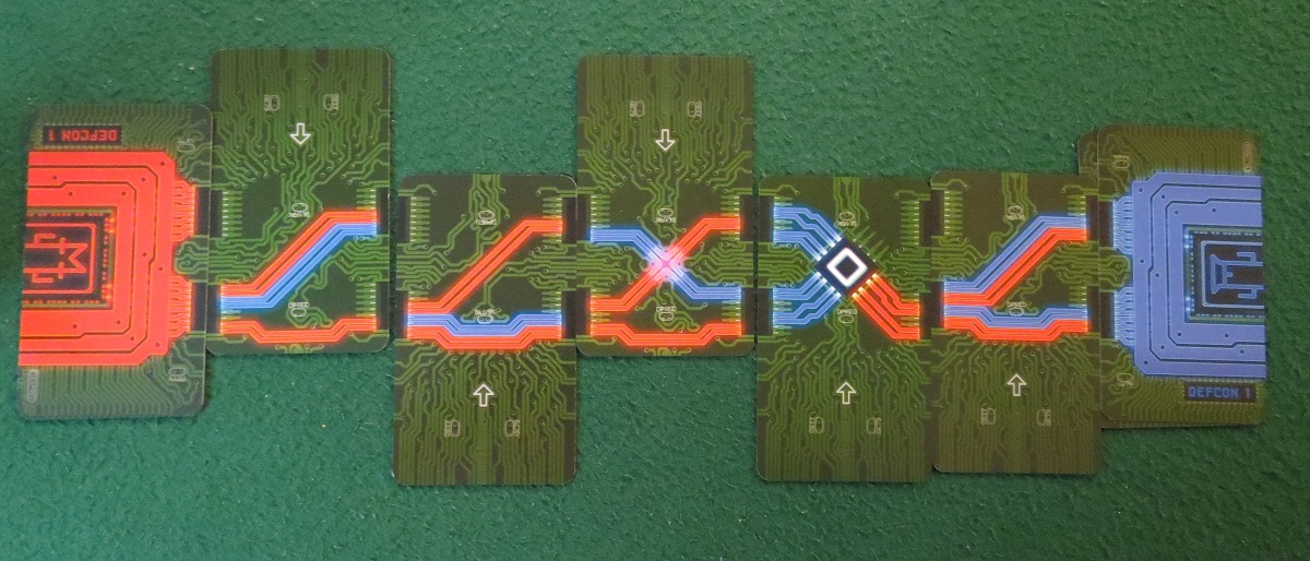 But bit by bit everything slides into place. With a line of circuit boards laid out between two opposing mainframes, your goal is to trace a complete line of your color to the enemy’s front door. Manage that and you’ve just degraded the opposing force’s DEFCON readiness, bringing them one step closer to total annihilation. You can swap cards from your hand with the circuitry on the table, flip circuits over to reveal new configurations, and tinker with what you’re holding.