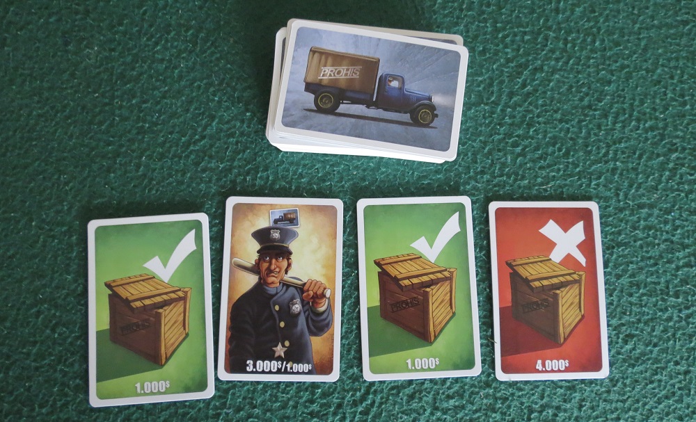 In some ways, Prohis provides an even smoother ride than Sheriff of Nottingham did. This comes as a surprise because Prohis is the slimmer of the two, not to mention the later arrival. Where Sheriff showed up with player boards, fancy snapping baggies to hide your contraband in, multiple types of legal and illegal goods, and lets you become the Chicken King for extra cash, Prohis is just a fat deck of cards. Each turn is as simple as choosing to draw a couple cards or to load a convoy to your warehouse, where cards will remain until they’re scored at the end of the game. If you choose the latter option, anyone can opt to play a prohi to inspect your trucks, and every so often someone will reveal another prohi to outrank the first. This means that anyone can be the sheriff at any time, can jump in and call you on your bullshit. For anyone who’s ever sat through a round of Sheriff of Nottingham where the inspector couldn’t see through all those transparent lies, this is the one for you.