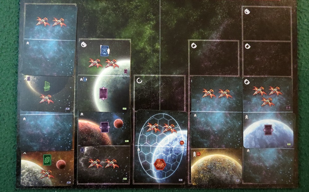 See, it isn’t sufficient that each card must be built atop other cards, here they must be literally placed atop each other, with each squadron covering the top half of the card below it. In isolation this isn’t a big deal, but all those fancy icons, the moves and flips and blasts both against enemy ships and your own, activate every single time they’re revealed. Lose a squadron during battle and whatever icon they were concealing will now be activated, prompting mid-volley card flips, rotations, or fighters moving between lanes. Reveal that stupid “shoot your own cruiser” icon and you’ll be treated to the same stupid card shooting your own stupid cruiser all over again.
