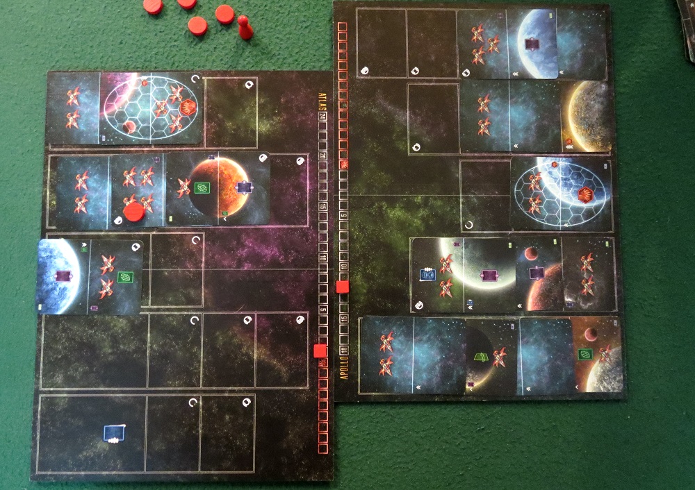 Along with your opponent, you take those cards and begin filling up your space-lanes, countering opposing buildups and looking for ways to maximize the number of fighters that can break through the enemy formations to strike at their cruiser. Better cards can only be played to forward “levels,” though you can always flip a card onto its weaker backside to place it into any spot. This tension, between setting up your cards for offensive potential or to counter the enemy swarms, and between placing your best starfighters into limited forward positions or as stepping stones for other squadrons (or to defend a weakly defended lane), does a decent job of creating mounting tension. The fact that the first player to pass also gets to reposition the cruisers — an act that physically shifts the two cruiser boards in relation to one another — renders entire space-lanes completely ineffectual and is one of the game’s coolest features.