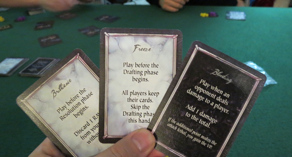 And they still don’t compare to shadow magick cards. These are the suckers that make enemy players pay damage in victory points rather than health, or rearrange the resolution tokens to ensure your attack happens before an enemy gets a chance to heal, or trade your potato dumpling of a hand for the plush set of cards your neighbor was just grinning about. Regular magick cards are sort of dickish; shadow magick are the tradecraft of the wicked.