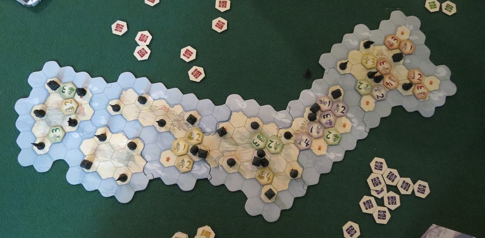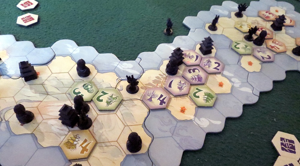 For one thing, most turns will only see a player placing a single tile. Play too low and you’ve just made it easier for someone else to snake the settlement from you, play too high and you might have just wasted a useful tile on a spot that nobody would have contested. Then again, maybe it was your intent to scare people off. Either way, Samurai is often a game about taking as much as you can for the smallest possible investment. While it can be pretty to fill up an area with lots of purple tiles, it’s even better to let a pair of enemies squabble over a settlement before making one or two well-considered adjustments and seizing the loyalty of the people for yourself.