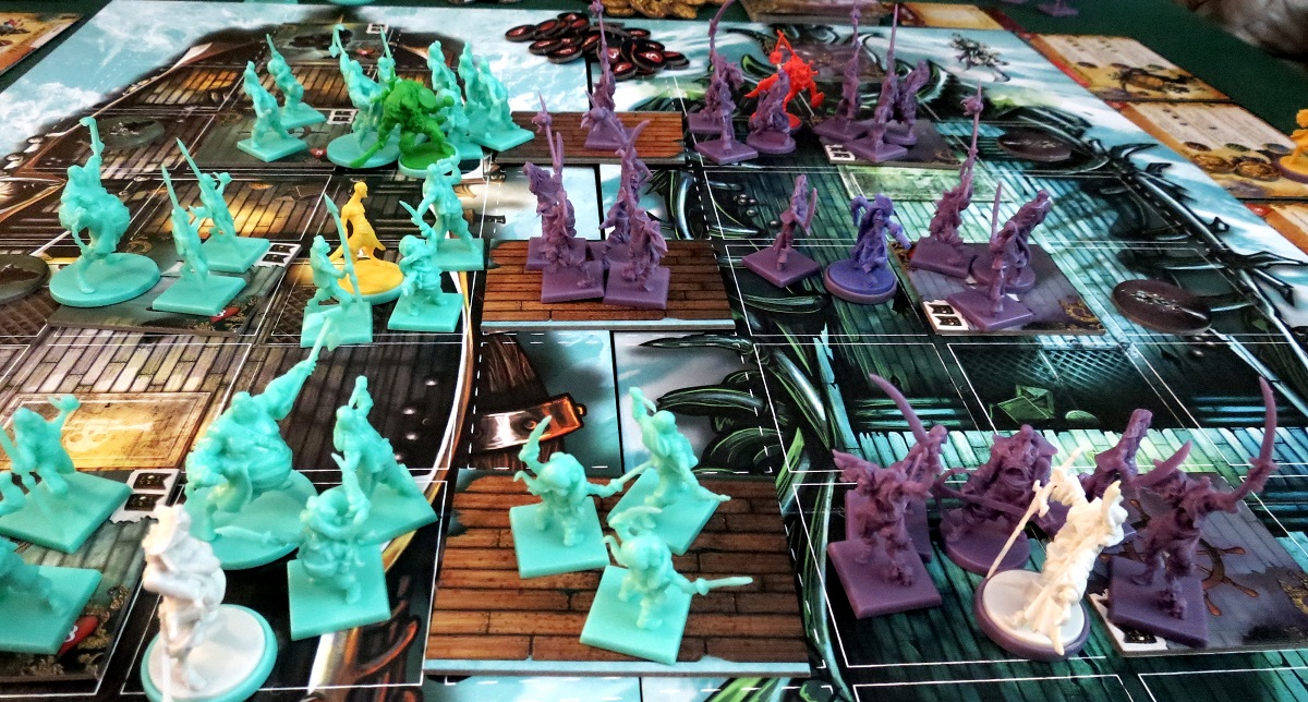 The possible benefits, however, are enormous. Not only do you win once you destroy three objectives, but each one’s destruction also confers some sort of benefit. Destroy their deck guns and they won’t get a free barrage every turn. Splinter their helm wheel and you can hold a bonus tide card (more on those later). Plunder their armory and all your heroes become stronger. Suddenly, the prospect of swinging over the briny sea, forcing your way past some deckhands, and risking a legendary pile-on becomes worth the occasional pirate sleeping it off.