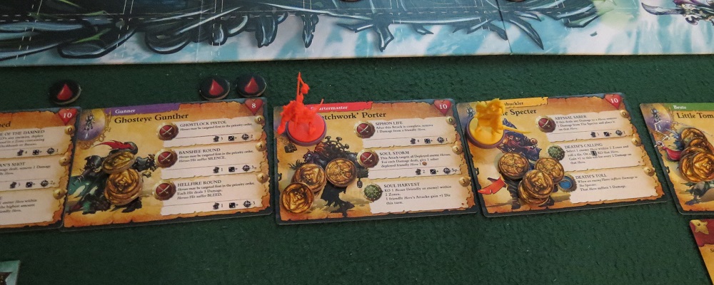 However, this was all part of my plan. See, Captain Albrecht had another ability in addition to his silly healing pistol. This one was called Devil’s Due, and it hurt an enemy hero with the same amount of damage that was on my most-wounded guy. My opponent had a fresh-faced hero standing nearby, Albrecht had saved up enough gold to afford Devil’s Due, and Little Tom was sitting pretty with 11 wound counters. You can see where this is going.