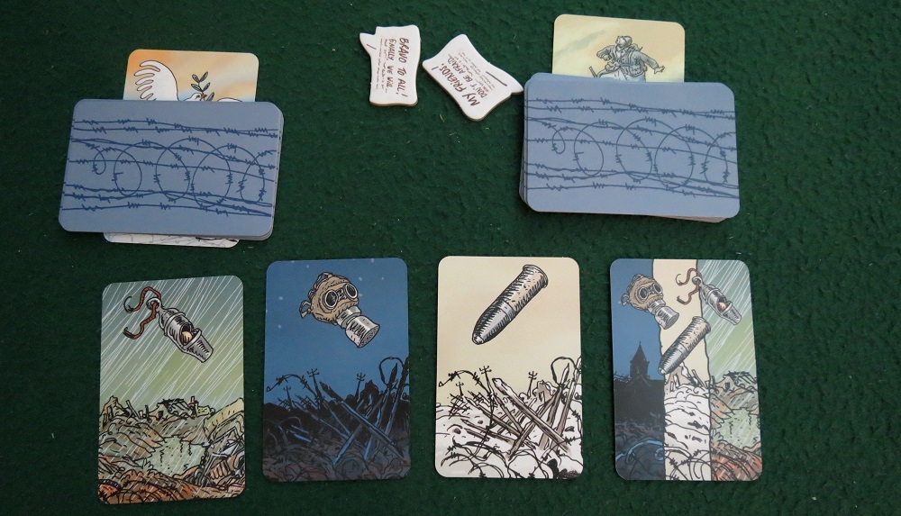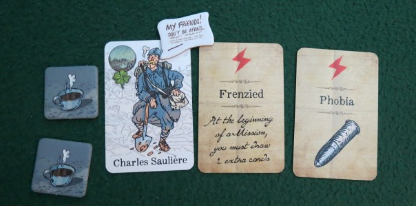 I’m not going to spend much time talking about how the game itself works. In short, each round revolves around a mission, everyone given a hand of cards and told to get rid of as many as possible. Most of the time, getting rid of a card means putting it in the middle of the table, where its symbols (an artillery shell, a gas mask, a whistle, night, rain, or snow) threaten to add up and end the mission in failure, especially when “traps” bring out entirely new cards from the deck. Other types of cards are placed beside your character, representing the accumulating ailments of their weariness. All but a single one of these are distinctly non-visible. The rest revolve around wounds unseen. Your group of friends is forced to endure devastating indignities, becoming fragile, clumsy, mute, demoralized, or panicked. Phobias and traumas develop. Missions are threatened when someone becomes absent-minded or selfish.