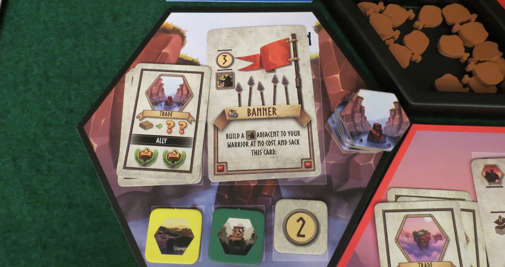 Each location features exploration cards, conquer tiles, trade, and spoils.