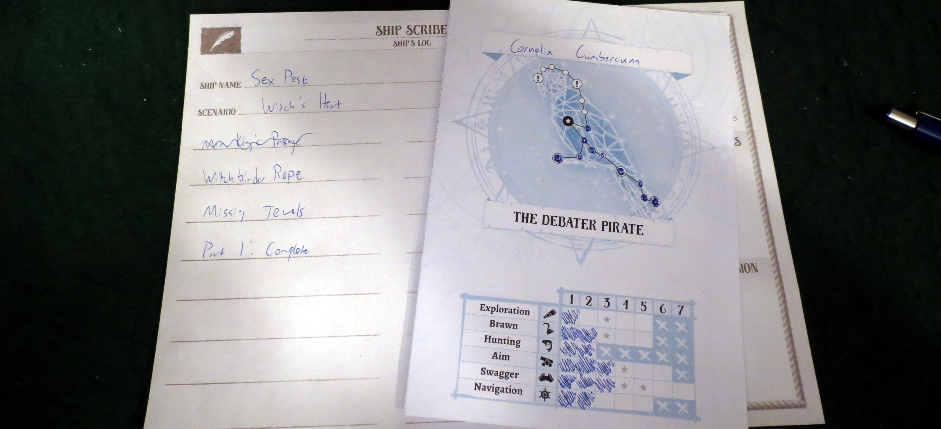 I loathe even writing it that way, although it’s true. At the outset of each scenario, you tear a sheet from a pad of pirates. Each of these sheets provides a grid of skills, a constellation, and some blanks to fill in, not only your name, but also tidbits from your past, the names of other pirates, or tidbits that don’t make any sense until later on. Maybe you’ll be Browneye McQueeg, grifter pirate, and be asked to write down a condiment or dessert (truffle butter), a smelly animal (sea lion), and a famous person (Captain Jack Rackham). Or Cornelia Cumbercunn, debater pirate, who attended a fancy university (Saint Titswallop Correspondence College) and has a female pirate friend (Sally Side Saddle). Or Roxy the Rumrunner, assassin pirate, who wields a cool weapon (scythe) and has a high number on her mind (5,324,072).
