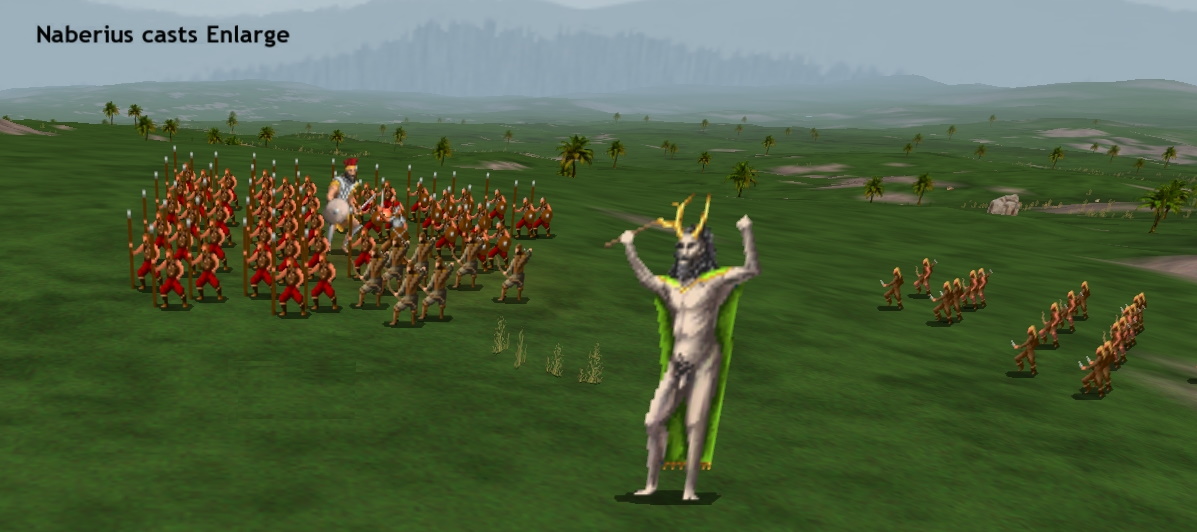 Take the above images. In the first one, you can see a race of Fomorians. Disgraced giants, they’re tough in battle but prone to becoming overwhelmed by a dozen spearheads getting forcibly inserted into their knee joints. What’s a big boy to do? Employ tiny humans, of course. Also, in this case, raise some undead fodder to absorb ranged fire and magic projectiles. Once the enemy is worn out — which can happen, both because every single action accumulates fatigue for every single individual unit and because you’re probably lobbing draining spells all over the place — it’s time for the big guys to charge in and make raspberry jelly.