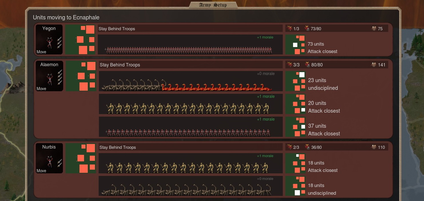 Your actual commanders benefit from some extra granularity. It’s still possible to issue them only a single command, and the most common are “Cast Spells” for flinging whatever pops into their heads and “Stay Behind Troops” so they don’t die prematurely and send their attached formations fleeing the battlefield in grief. Then there are times you’ll want to tailor their behavior, at least for the first few turns of the battle. As I mentioned earlier, there are loads of spells to research, and picking the right ones can swing testy fights in your favor. For example, fielding an army of cave-blind troglodytes means that temporarily blotting out the sun will hamper your foes far more than yourself. You’ll need properly leveled mages, the right assortment of gems, and maybe some darker tricks like communions or blood slaves to boost your mages to the proper aptitude, so it pays to curate your research, groom the proper sorcerers, and tell them when you want them to spend a whole bunch of fire gems transforming the battlefield into a raging inferno and when you’d much rather they didn’t waste any resources on some upstart peasants.