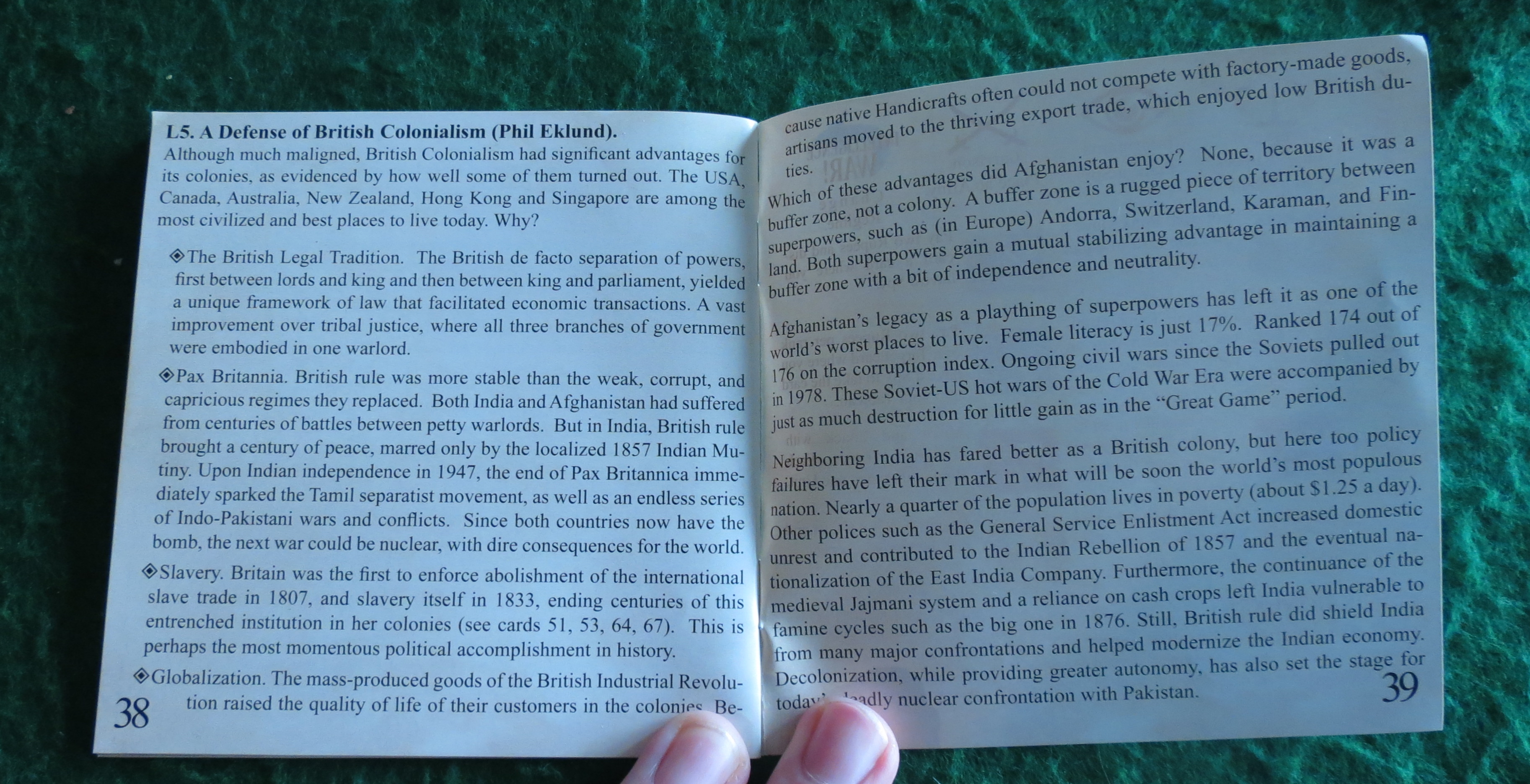 As I wrote above, the absolute first step of any game is “read this rulebook.” Not for everybody; in my own gaming group the roles are divided so that one person reads the rules (me), one person plays Angry Birds (Geoff), and everyone else listens. Even in that case, the first step has occurred as surely as one person has unfolded the board for the benefit of everybody. Thanks to the primacy of this first step, it has the unique position of being a player’s opening encounter with a game’s framing, and can poison or bless the well. Perhaps this is the reason for the hubbub surrounding Phil Eklund’s essay, “A Defense of British Colonialism,” in the back of the first edition of Pax Pamir’s rulebook. This is the first of Pax Pamir’s three arguments, and it rears its head before the actual game draws its first breath.