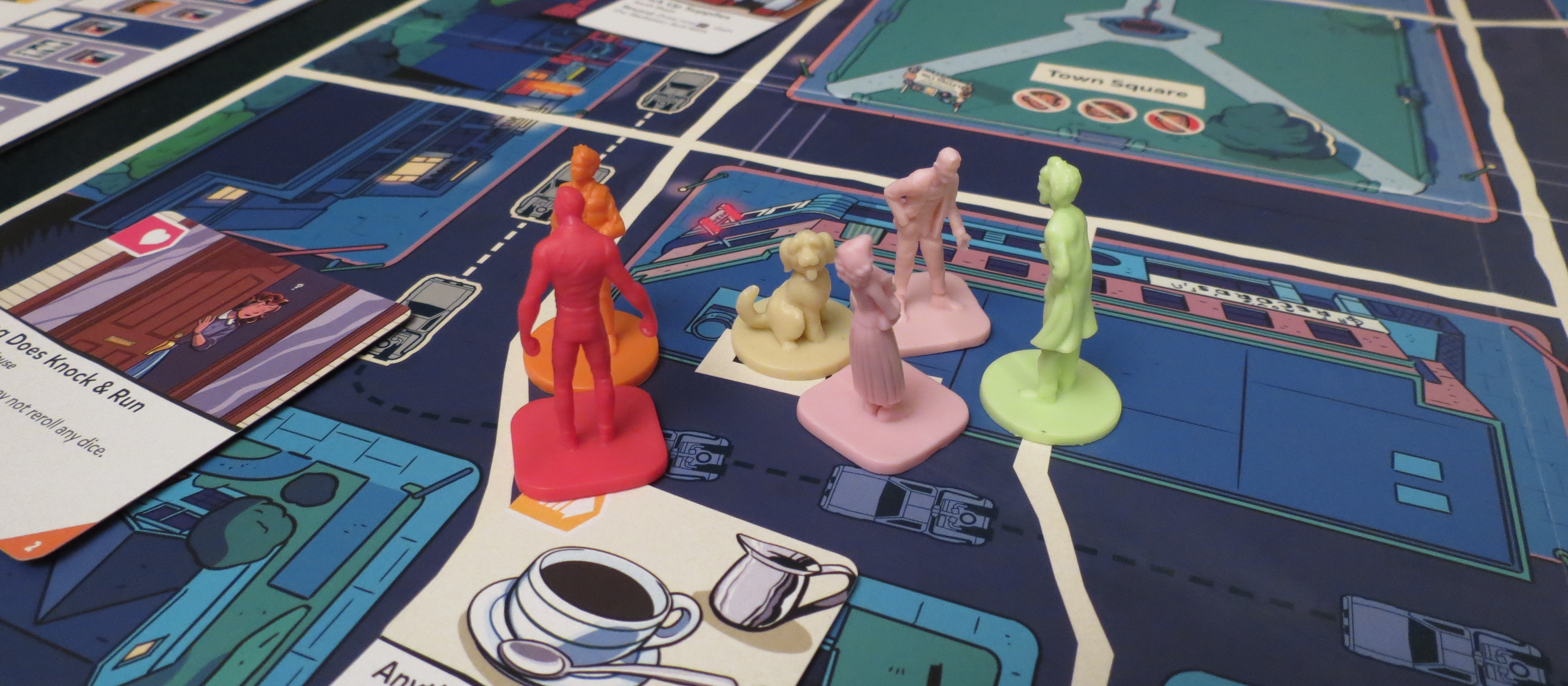The patience of “Manure Truck” is certainly a contrast with the high-stakes car chase from the film. But what’s interesting is its outcome. Oh, not the whole thing. Upon completion, its first effect is that you draw a power tile. These gradually accrue on your player board, adding new dice or special perks. Every card challenge, whether it’s an opportunity or trouble, offers a power tile if you resolve it. Early on, these are a godsend. Later, when you probably shouldn’t be bothering with most opportunities anyway, they’re just something else to juggle on and off your board. Like the game’s approach to rolling dice, it’s a system that’s principally functional and entirely inoffensive.