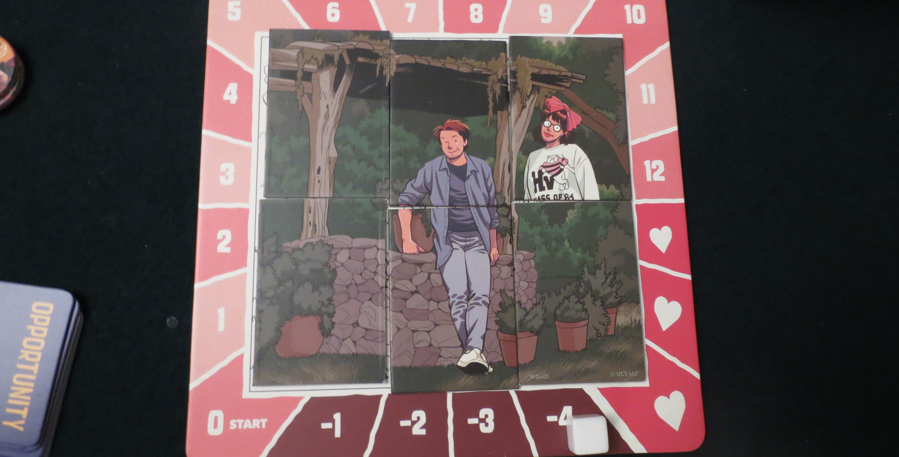 But that’s not all “Manure Truck” accomplishes. After pulling your new power tile, you also get to move Biff to the clock tower, push him flat on his back, and add a knockdown token beside him. Oops! Looks like Biff is stuck scrubbing his car. What’s the in-game effect of this? Basically, Biff can’t move for a bit. When you draw one of the round-opening movement cards that sends George and Lorraine scuttling around the board — likely in opposite directions, prompting you to corral them into the same place so you can fulfill more lovey-dovey heart challenges — Biff icons normally send him chasing after Lorraine or bullying George. The same goes for when you roll a Biff icon, which has the same odds as rolling a wild. Whether revealed on a card or as the result of a roll, Biff goes out on the prowl. When he catches Marty’s parents, he diminishes how in love they are. That is, unless he’s busy picking himself up courtesy of a fight or a card like “Manure Truck.” This is one of the game’s central tensions. You have your main tasks to accomplish — getting the DeLorean ready to travel through time, making Marty’s parents fall in love so Marty doesn’t fade out of existence — but you’re also busy dealing with Biff’s intrusions into the narrative.