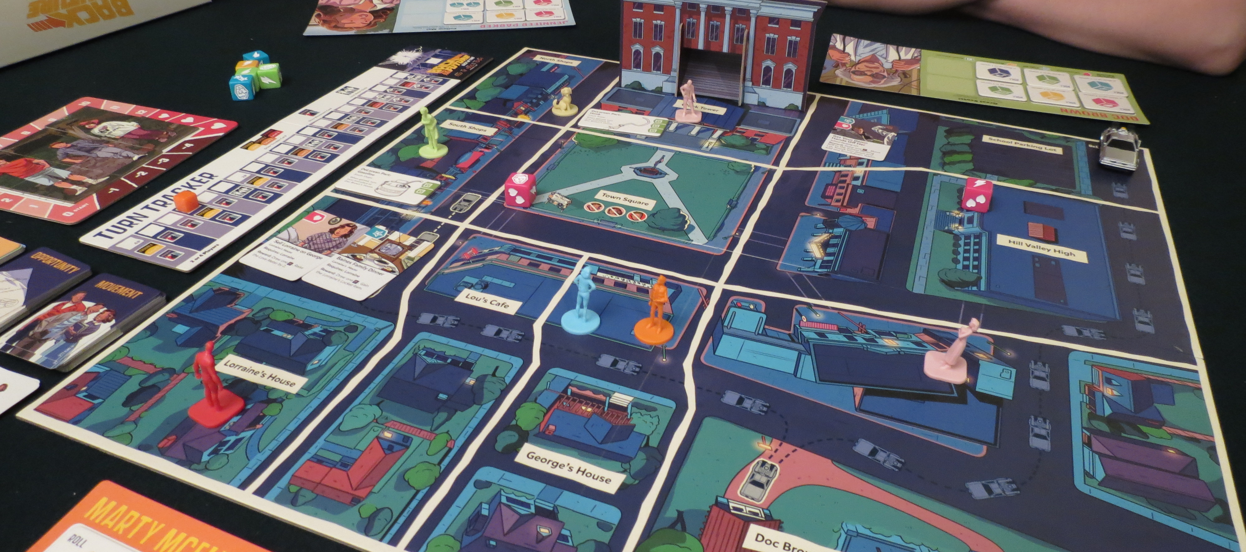 Let’s break it down step by step. “Manure Truck” is an opportunity card, but more broadly it’s a dice challenge. Back to the Future: Back in Time isn’t the same game as Back to the Future: Dice Through Time, which also released this year, but where it lacks dice in its title it makes up for them in enthusiasm. Nearly everything you do in Back in Time is about dice. Whether you’re wheeling the time-traveling DeLorean to Doc Brown’s house, building the equipment necessary to send Marty from 1955 back to 1985, forcefully persuading Biff Tannen to stop groping Lorraine, or gently persuading George and Lorraine to fall in love so they can eventually get around to having Marty, you’ll be rolling dice to determine the outcome. Dice are color-coded to different challenges, but any die has a fairly high chance of rolling a wild, making it possible to take long shots or build a proper match depending on the circumstances and how far you’d like to push your luck. As far as dice games go, it’s a boilerplate setup: not much to look at, but Marty McFly sure put a boilerplate to good use in Back to the Future Part III, so who am I to complain?
