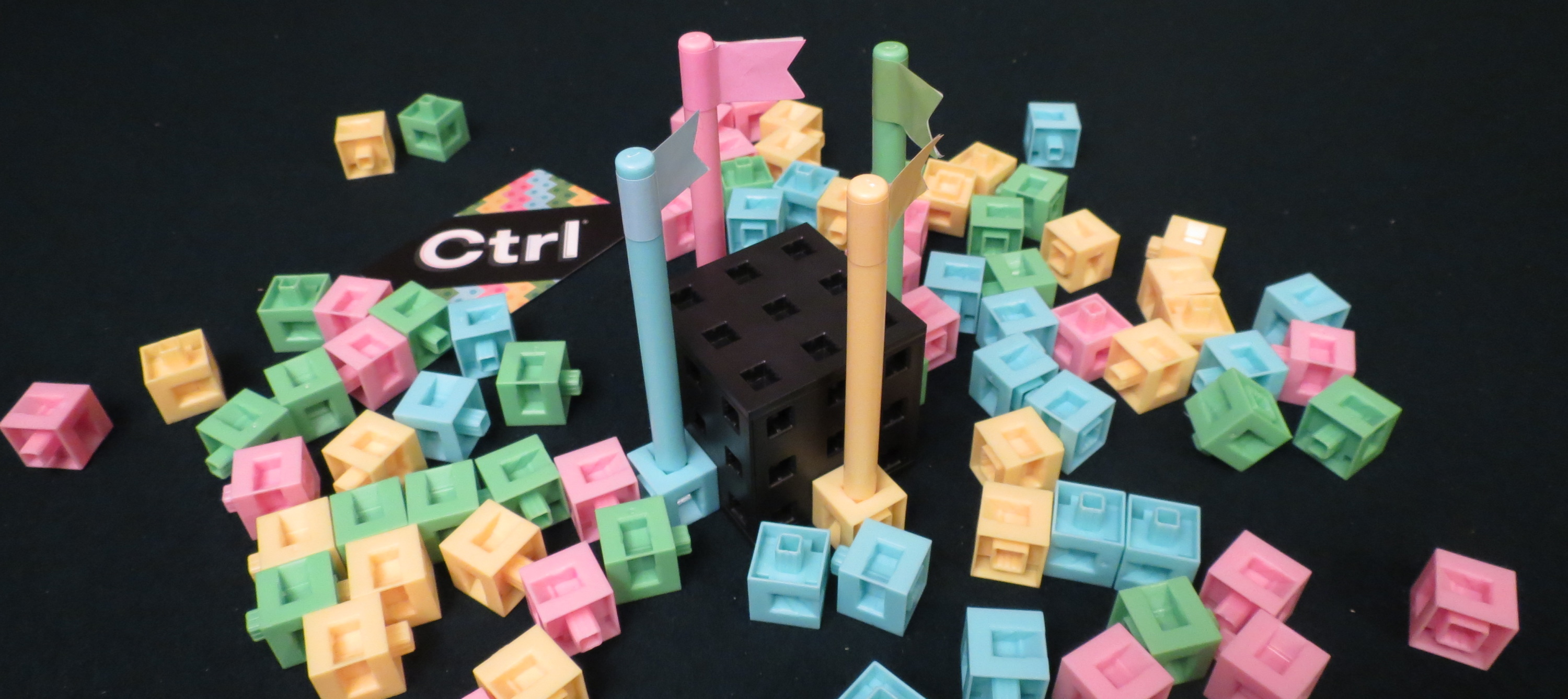 Is that enough? Well, not really. There are two problems that prevent Ctrl from realizing its full potential, one physical and the other mechanical. In the first case, the plastic is disappointingly light, with the windows on four sides of each cube angled for easy removal of flags and other cubes. Unfortunately, “easy removal” often means “self-removal,” especially when flagpoles are erected on lonely perches or pulled free at the start of a turn. At times entire clusters of blocks pop loose, scattering across the table and transforming Ctrl into a memory game as everybody tries to recall precisely where everything was slotted. And heaven forbid you dare pick the thing up. You might as well flip the table. Instead, Ctrl quickly instills a unique tactility. Careful movements, pinching the blocks whenever you touch them, carefully installing each block’s main peg against the most stable anchor, sliding the cube to the next player rather than passing it; these are the steps that keep the game going.