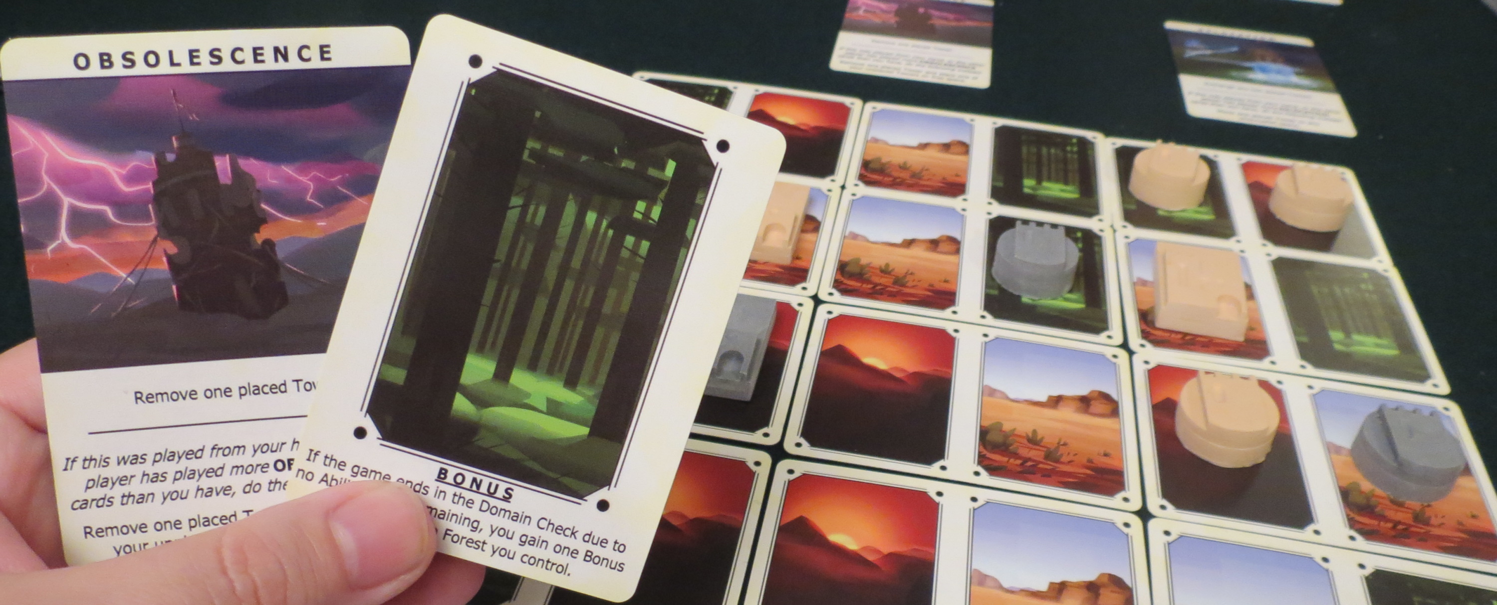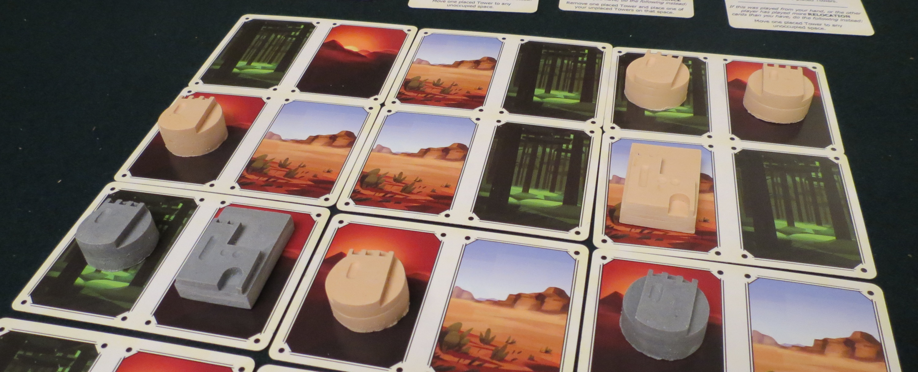 This overall structure is persnickety, but that won’t be anything new for fans of Clowdus’s work. His games often feature a two-pronged struggle, not only against your opponent but also against the limitations of the actions afforded to you. To some degree this is true of many games; here, as in some of Clowdus’s other designs, that struggle is more akin to taming a wild horse than trying to determine which action best suits the moment. Take, for example, the “tower” action. This permits you to establish a tower, but only adjacent to a stronghold. This can come across as a wasted move because strongholds project their control to any empty adjacent space, while towers simply control the space they’re seated on. In terms of control, you’re building a tower that controls its space, but you already control that space. This, then, is often a setup to the alternate function of the tower action, which lets you build a tower on a card where you already have a tower. Between one usage of the tower action and the other — which, it should be reminded, you cannot use within the same turn — it’s possible to gradually play hopscotch across the map. Meanwhile, if you control more forests than your opponent, and you happen to place a tower next to their tower, you can replace their tower with your own. But! Only if those two towers share the same terrain card. If towers are adjacent across two cards, your takeover bid doesn’t count.