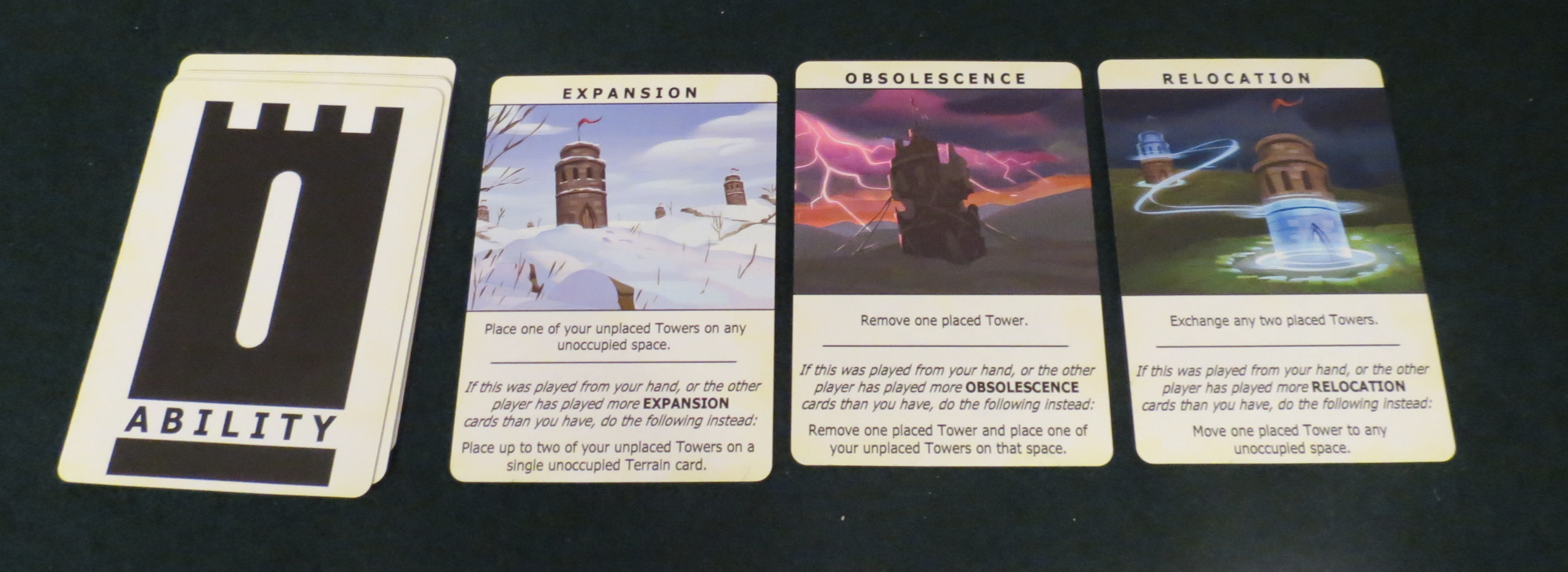 Like I said, it’s persnickety in a way that other small abstract titles are not. The same goes for your other actions. Building a stronghold either replaces two towers with one stronghold or teleports an already-constructed stronghold into the place of another tower. The game’s three ability cards trigger more flexible options, like removing a tower, placing a tower anywhere, or swapping two towers, while also featuring a more powerful version that only triggers if you play the card from your hand rather than from the central market (which only happens once per player per game), or if your opponent has played more of that card than you (which I’ve only seen happen once).