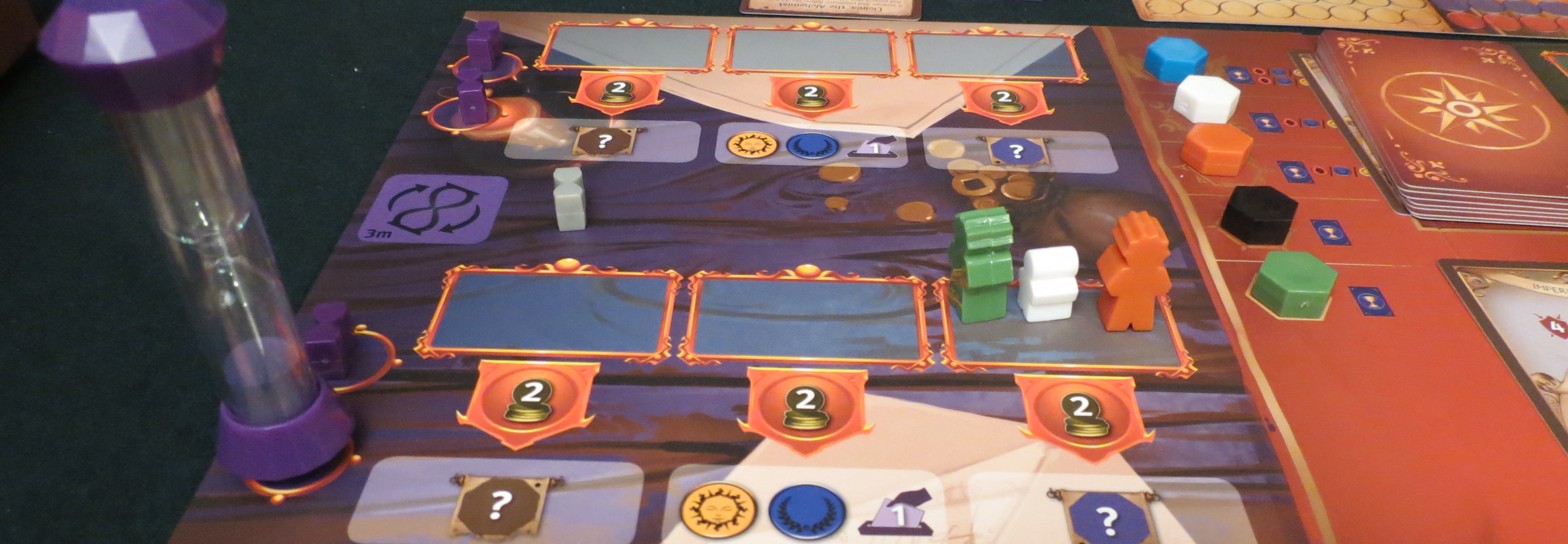 Okay, so you’re placing workers to earn and convert resources into points, with a few side-hustles along the way for voting privileges and whatnot. What forces Pendulum off the beaten worker-placement path is that the whole thing is timed. There are three “worker zones,” each split into two rows. Between these two rows are little sand timers of differing speeds: forty-five seconds, two minutes, and three minutes. Workers can only be placed or removed from spaces where these sand timers are not; similarly, they can only activate the ability of a row where a sand timer is currently situated. Every so often a sand timer will run out, at which point you’re free to flip it over to the other row in that zone, thus changing its shift. Spent workers can now move, working workers can now work.
