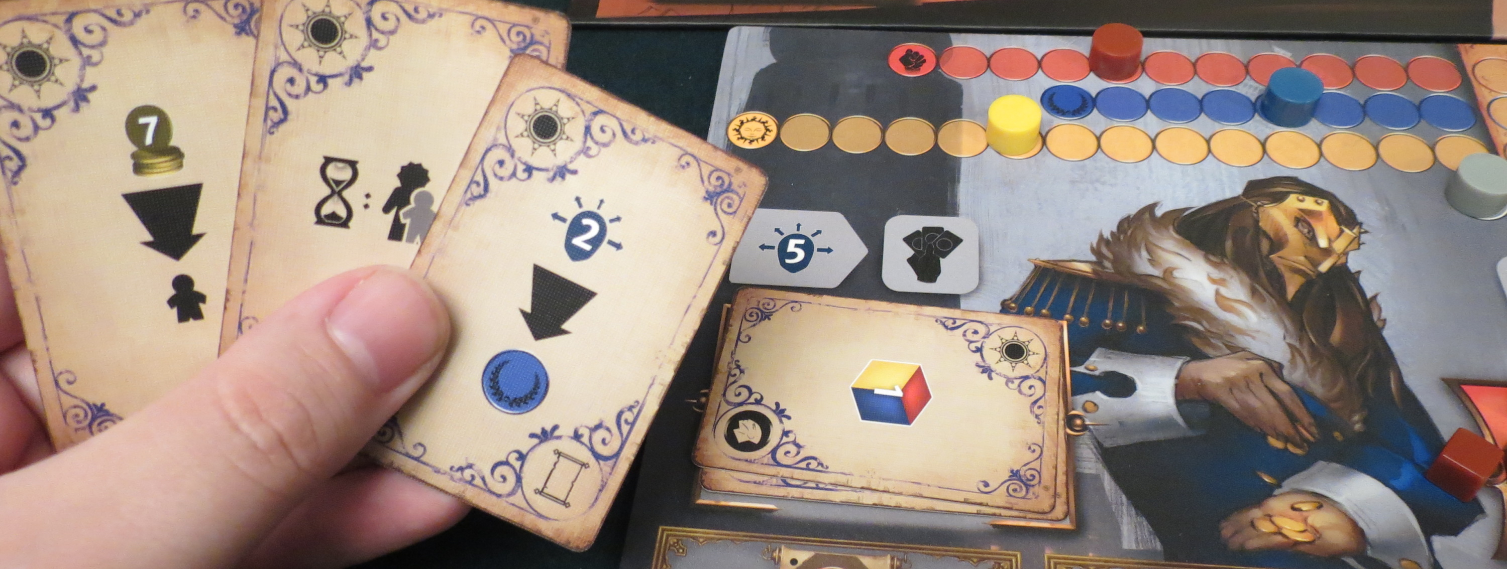 Pendulum is about earning a handful of precious victory points. “Dan, lots of games are about that,” you’re saying, with a flatness that conveys your displeasure at how far I’m stretching this aphorism. Fair enough. But Pendulum is especially stingy. Working in reverse, your goal is to earn at least one apiece of four flavors of victory points. There’s red, which is usually tied to conquest. Blue seems to appear on cards. Yellow must be found somewhere since I’ve won a couple times and winning means I’ve earned a fair few yellows, but these are always such a low priority that they’re usually the ones I scramble to make up near the end of the game. Gray is the toughest, but it’s also something you can only earn once by completing a… quest? Adventure? Special order? Never mind what; fulfill the thing once and you’ll earn a gray point. In each case apart from that, you’ll need to earn a whole lot of reds, blues, and yellows before they start counting as actual “victory points.” Hence why you can win with only one point of each.