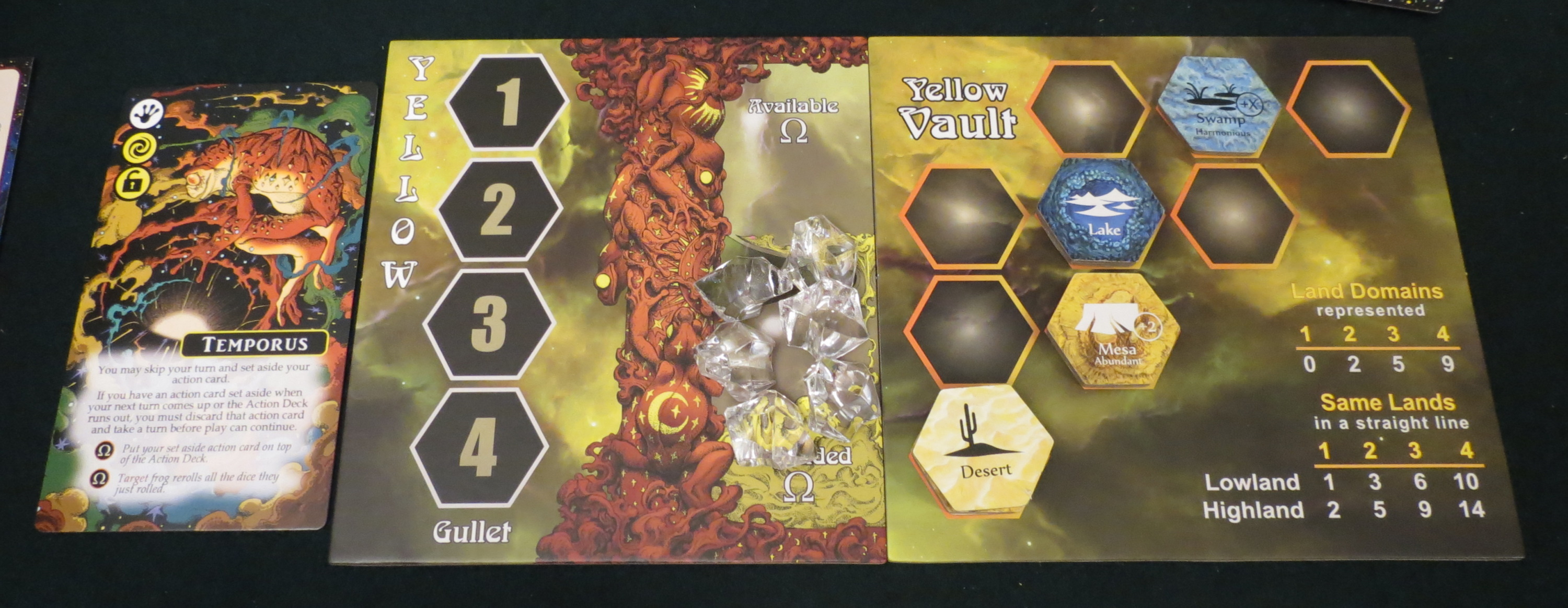 Five, the second deck, contingent on the first, that sends splinters of the world-that-was colliding with itself and threatening to prematurely conclude the feast. Where other games are orderly, featuring a set number of rounds and no more, Cosmic Frog refuses the dignity of concluding at the proper moment. When the shard fragments, it is done. Also done is any sense of fairness. Every frog begins with the same number of cards in the deck, but it’s rare that the deck will conclude that way. When a splinter strikes you, you are injured, your landmasses lost, your position ceded as you spin into the aether. In similar fashion, when the final splinter breaks the shard, any remaining actions are also lost to the cataclysm.