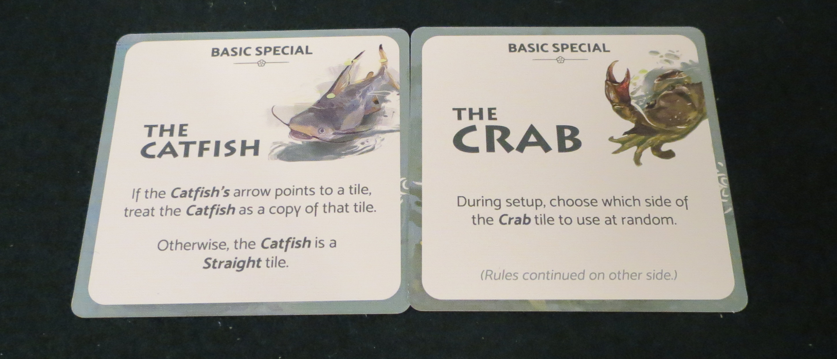 Most obviously, floating along is as easy as sticking to the current. Each space you float through deposits a petal in your wake. Similarly, whenever anyone floats through a space, every petal already lounging there earns a point for its owner. Breezy. Not that the outcome is predetermined by the initial arrangement of the river. Every turn opens with the current player swapping two adjacent tiles, a seemingly minor change that can amount to a whole lot, especially as they aggregate turn after turn. There are more specific rules, but even those are sparse. In the rare case that a current will spit you off the grid, your petals simply loop around to the opposite side, sometimes bouncing back and forth as though the river were in fact some cosmic cylinder, always cycling back upon itself. There are also special tiles. Every play features whirlpools, which nudge you in a particular direction before changing their orientation. Other special tiles are more interesting, to the degree that only two are used per game, enough to add some texture without causing confusion. These include point-bestowing water striders guided by the trailing player, trap-like dragonfly nymphs that subtract points, and a katana stuck into the muck so that its blade divides the current — and your petals — along two paths.