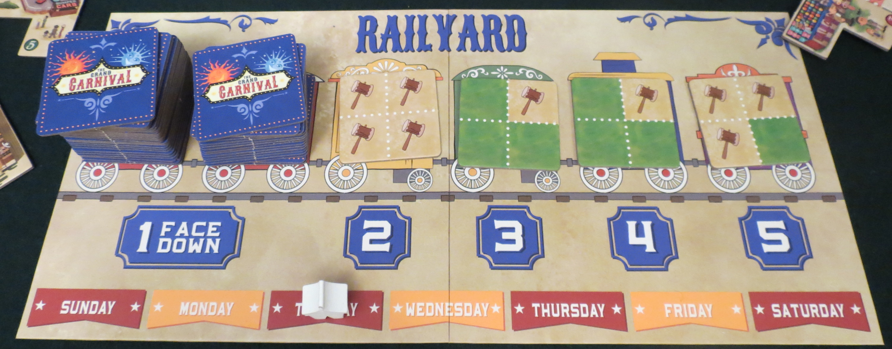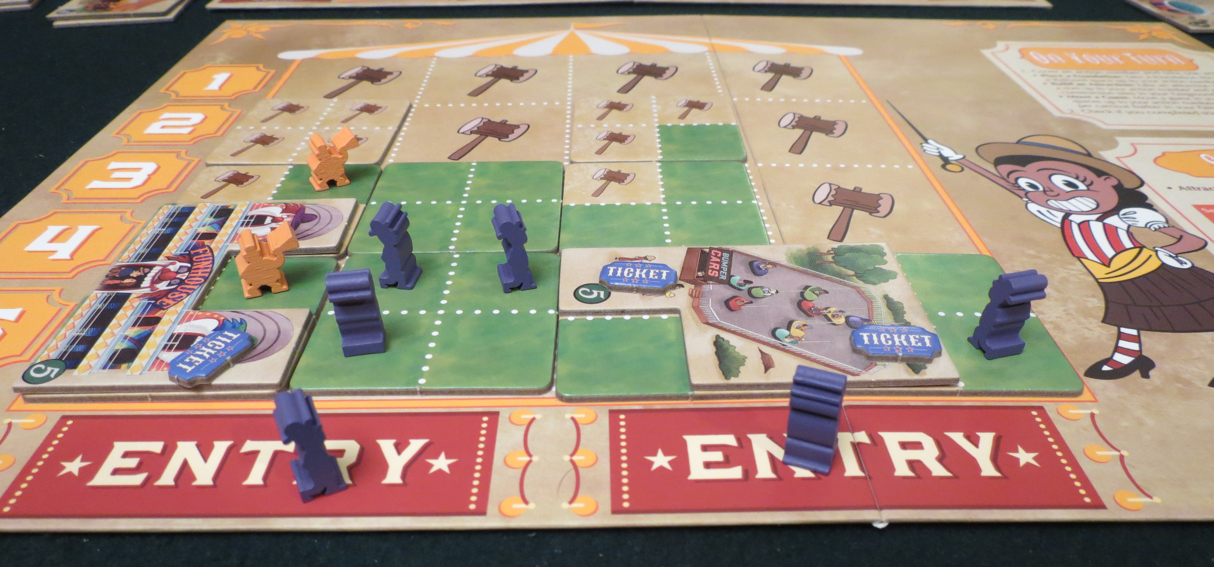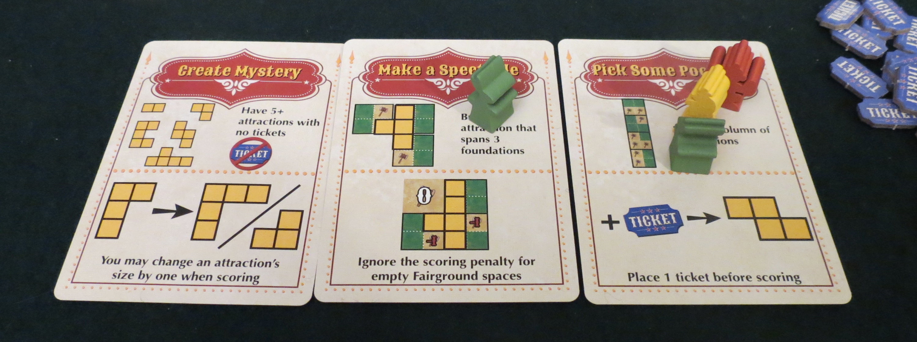 In fact, that precise timing is one of the game’s biggest departures since Rob had me look at it last. Originally there were end-game triggers, which could be rushed to deprive an opponent of entire chunks of points. The Grand Carnival now has less bite but a more sincere grin. And even though I tend to prefer games that nip once in a while, the friendlier approach suits it better. You’ll finish your carnival, or nearly enough, before the week is out. The focus has been honed, forcing everybody to keep one eye on their scoring chart and another on the dwindling supply of the best attractions.