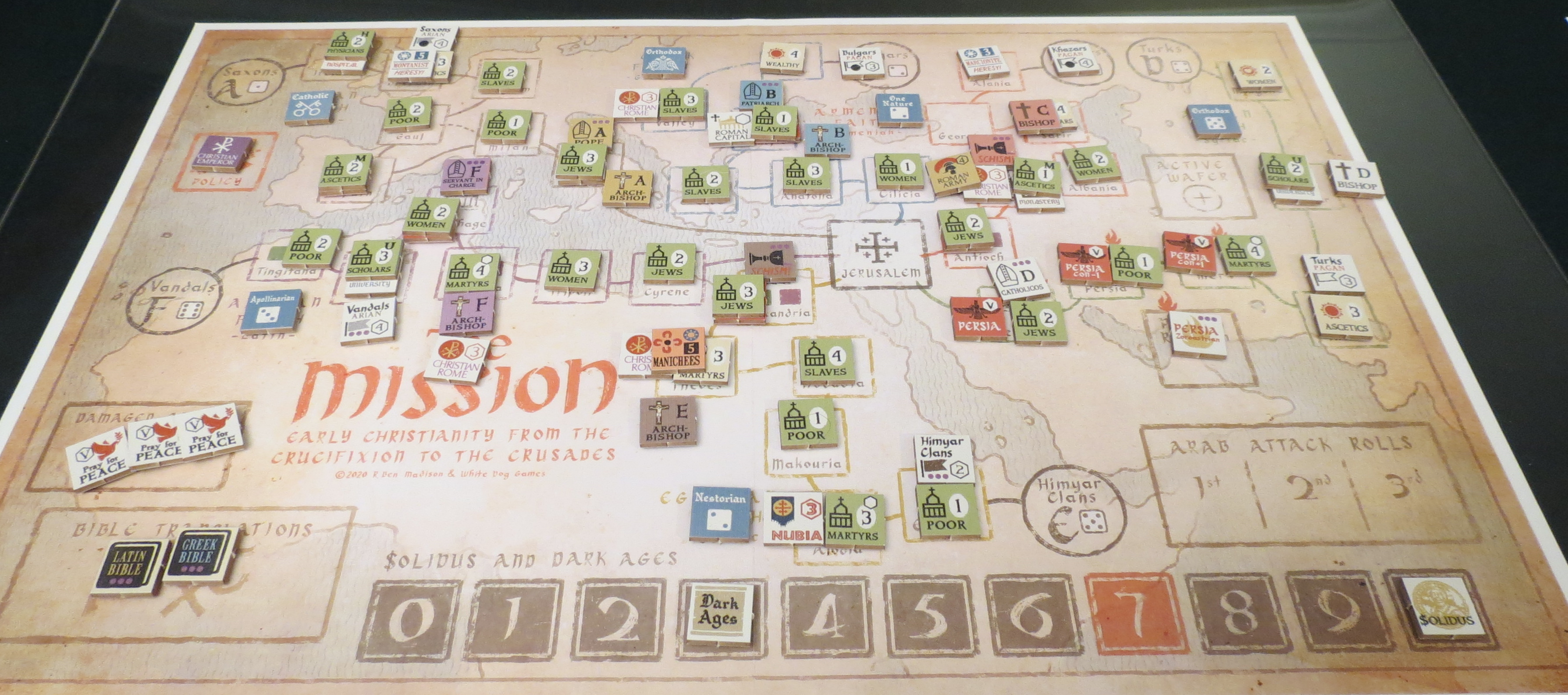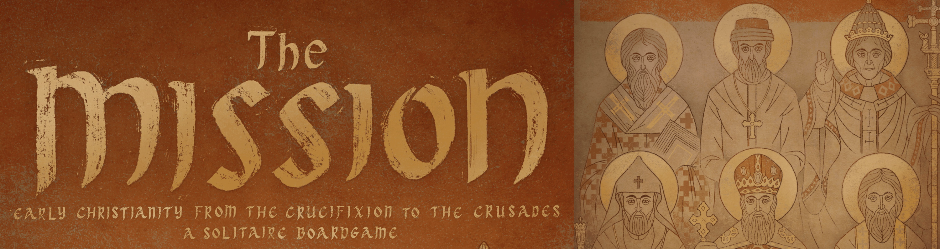 Too polemical. I’ve been waiting to drop that one on some unsuspecting victim ever since. You could even say it’s one of the reasons I was so eager to write about Ben Madison’s solo game The Mission, which charts the history of Christianity over its first thousand years. “From the Crucifixion to the Crusades,” as its subtitle goes. Sounds polemical to me! Brace yourself, Ben Madison, for thou art—