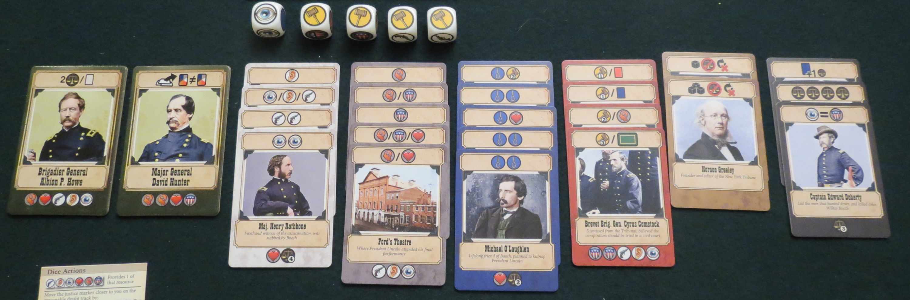 It’s also the most thematically appropriate portion of Unforgiven, for better and for worse. Better, because it’s a grandiose take on the reliable old card market, loading every pick with both short-term gains and longer-term opportunities and consequences. Worse, because the rest of the game doesn’t reproduce the same degree of verisimilitude. It’s possible that this is, in part, because I knew about Mary Surratt (unlike Louis Riel from High Treason). But it might also have something to do with a lack of context or even any differentiation between prosecution and defense. After one victory, I irreverently declared that we were going to “hang her, hang her!” Everybody stared at me in confusion; I’d completely forgotten that I was Surratt’s defender. The omission of broader context also seems peculiar. I’m unsure what I’m supposed to take from the whole thing — if anything at all.
