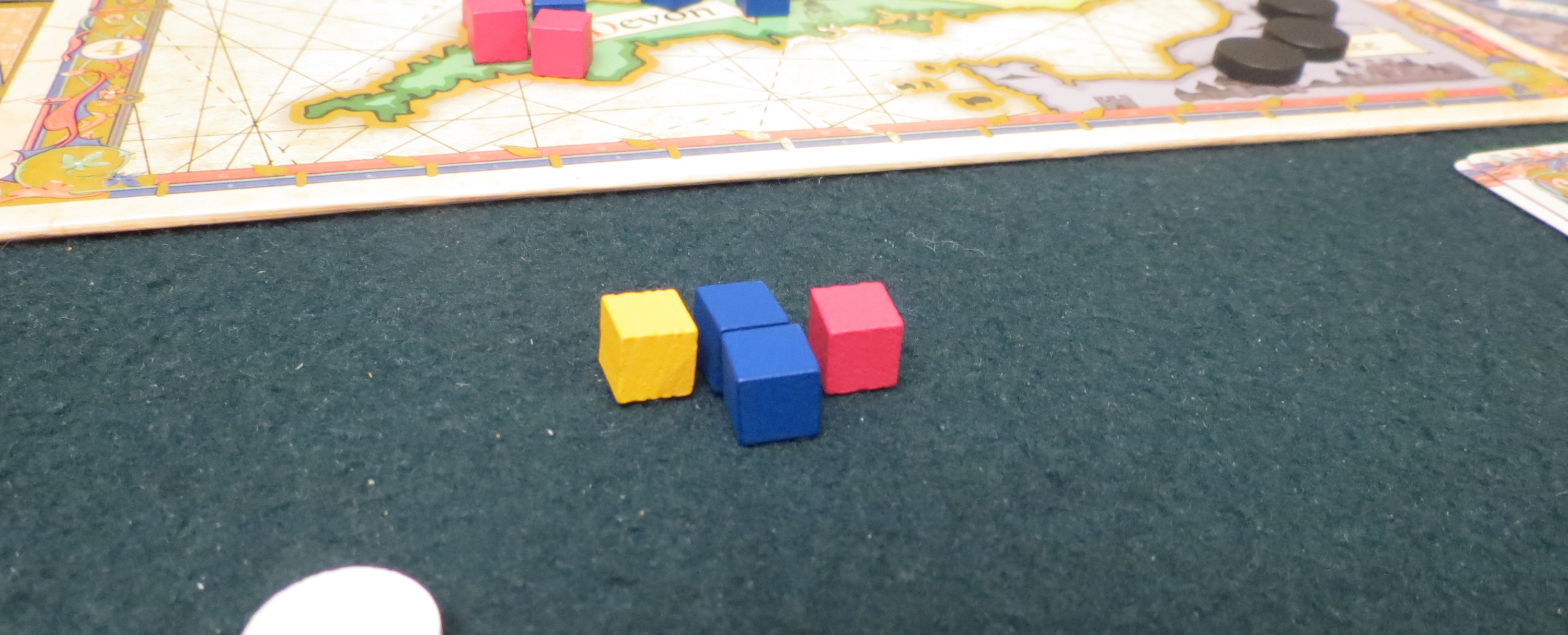 For the uninitiated, The King Is Dead functions much the same as the previous edition of The King Is Dead, which in turn functions in largely the same manner as König von Siam. The king has died, you see. Yes, it’s true. He’s dead, Dave. Now three factions are hoping to claim the old man’s chair. Their designations don’t matter that much, but for the sake of thematic flavor I’ll tell you that they’re the English, the Welsh, and the Scottish.
