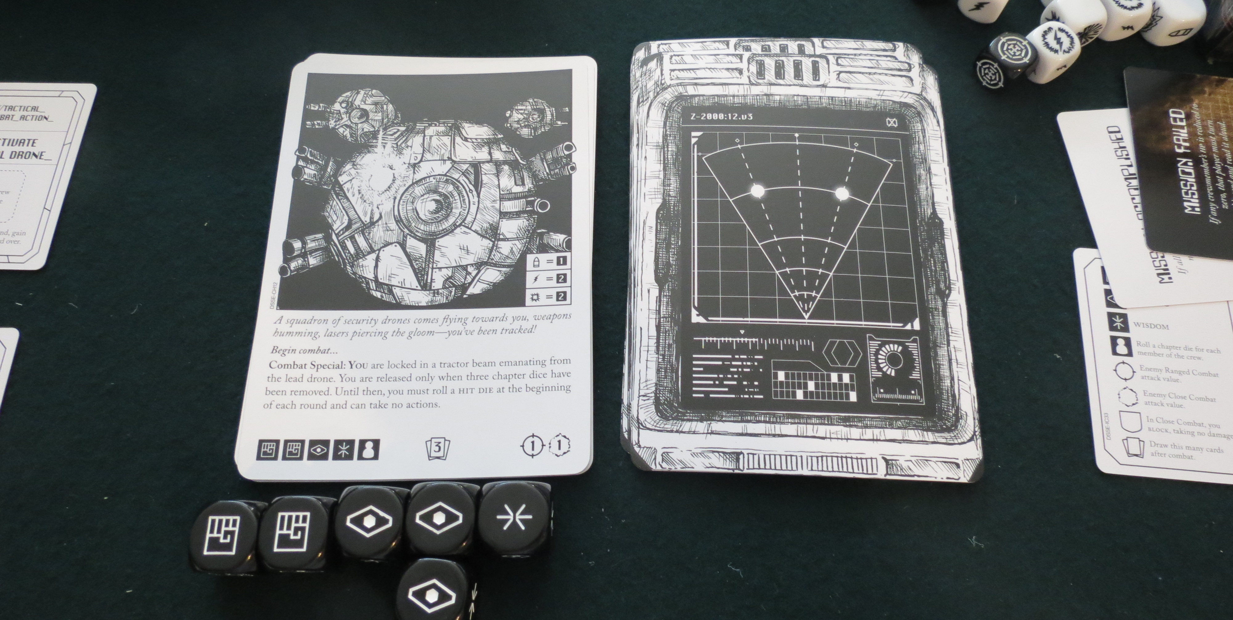 It does, however, care about dice. Which is a good thing, considering how often you’ll roll to see how something shook out. Combat is common. Skill checks, more so. Not that every chapter card requires a roll. Some ask you to choose between a roll or discarding an item, or between rolling and taking damage. Depending on your outlook on life, those might be the same thing as forcing the dice into your palm at gunpoint. In one instance, we approached a foe from behind. We had the option of tiptoeing away to the next chapter card rather than engaging in a fight. Tantalized by the promise of loot, one of my friends insisted we take her down. Unsurprisingly, we were soon beaten senseless. “How could I have known an engineer would be so tough?” my friend protested once the dust had settled and the hit points losses were tallied. We stared at him. Everyone had known it. Because everything in Escape the Dark Sector is dangerous, vicious, liable to leave you more ragged than before.