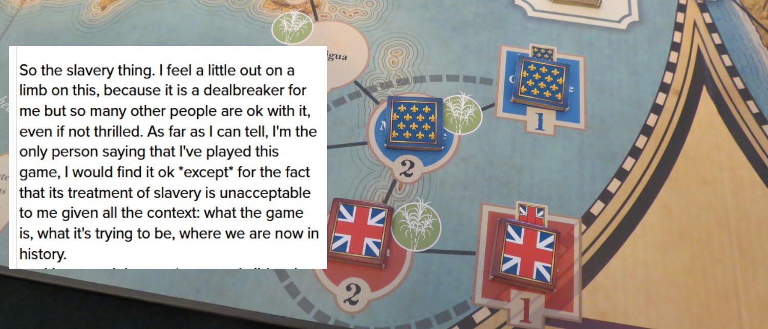 Because playing “gotcha!” is fun, every so often someone asks whether I would play a particular hypothetical game, usually by proposing an abhorrent setting. Would I play a train game that featured indigenous removal? Yes. A WWII game that considered the Holocaust? Sure. A set collection game about nude eighteen-year-olds? No.