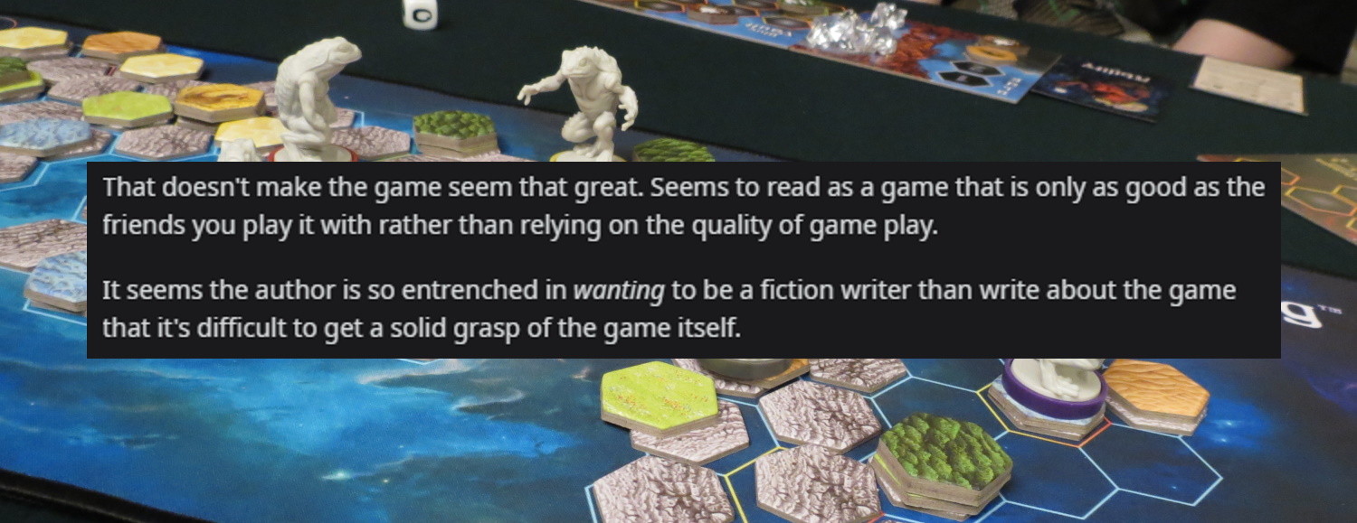 That last part is key. Every truly useful review is not only telling us about the artifact in question, but also about the critic. Don’t mistake this for autobiography; it’s permission to follow tangents, explore snake’s hands, and get personal. It’s a chance to fully explain why the game didn’t work for that person, at that time, with their values and priorities. This makes for better purchasing advice for anything that isn’t limited to sheer utility. Since board games aren’t clothes dryers or furnace repair companies, they demand that radical degree of subjectivity.