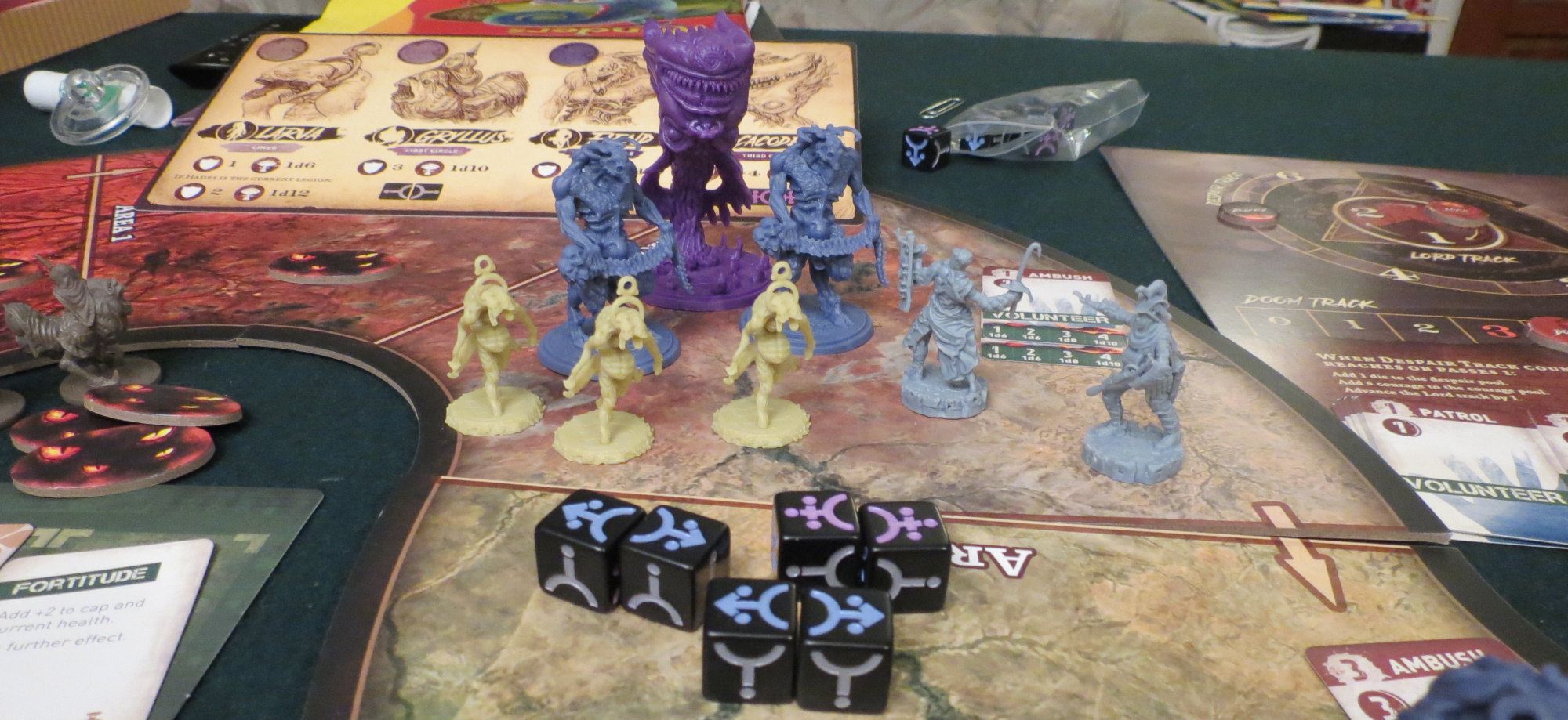 Anyone who’s played Cthulhu Wars or its overly fastidious descendant Glorantha: The Gods War will recognize the character mats. Petersen is up to familiar tricks here. In addition to hiring goons to fire upon any demonic intruders and occasionally soak up damage, characters also earn “gifts,” traded for courage tokens earned from the slaying of monsters. These cover slots on the character mat, themselves upgrades in their own right. Between upgrades both personalized and generic, characters take on shapes of their own, albeit predetermined shapes. Over time, characters may gain new attack dice or upgrade existing ones. A healer with a puny d4, an attack so flimsy it won’t even touch anything meatier than the game’s smallest pair of critters, might finish with a pair of d10s. Abilities are unlocked. Health pools are deepened. Free goons are pressed into service because your hero learned how to plaster on the charm.