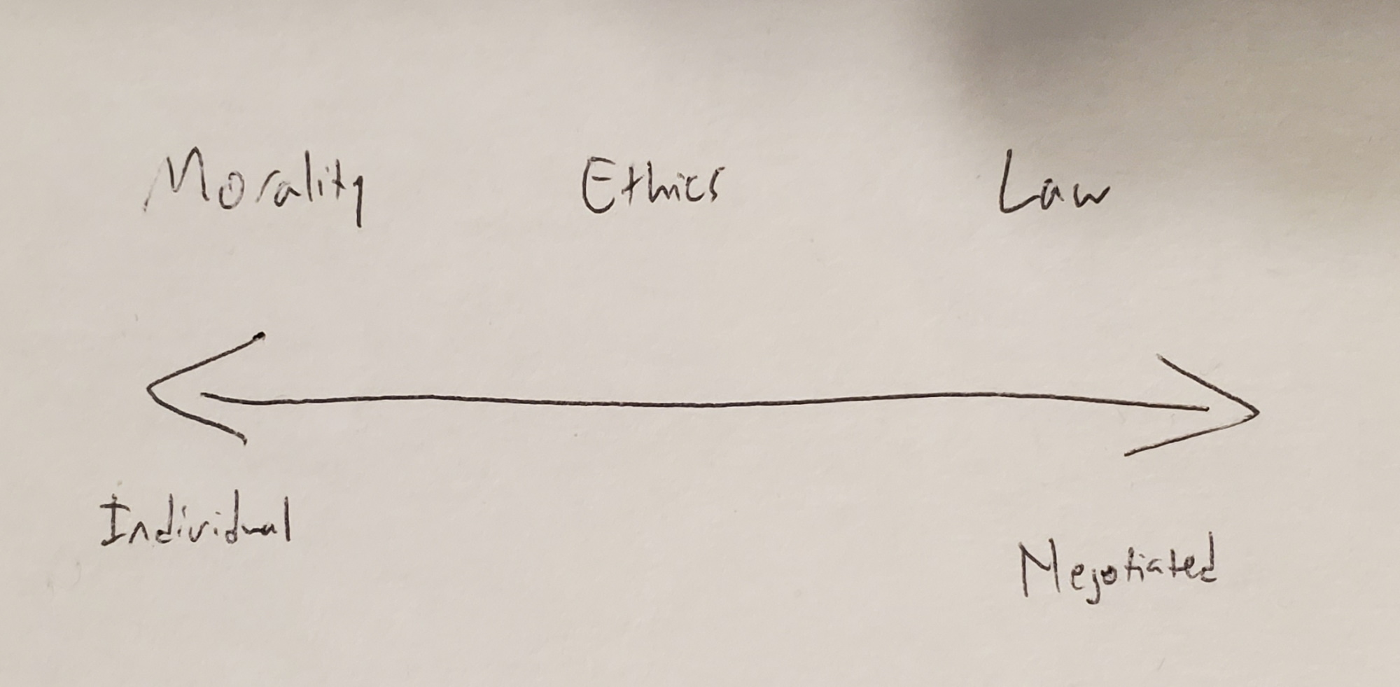 Ethics, meanwhile, takes us a step toward the far end of the spectrum. It’s still individual, even to the point that it’s driven by individuals. But it’s also more negotiated, often between groups of people in a shared profession or other organization. Law, of course, takes this further: it’s almost entirely negotiated by collective groups, and only represents ethics and especially morality by approximation.