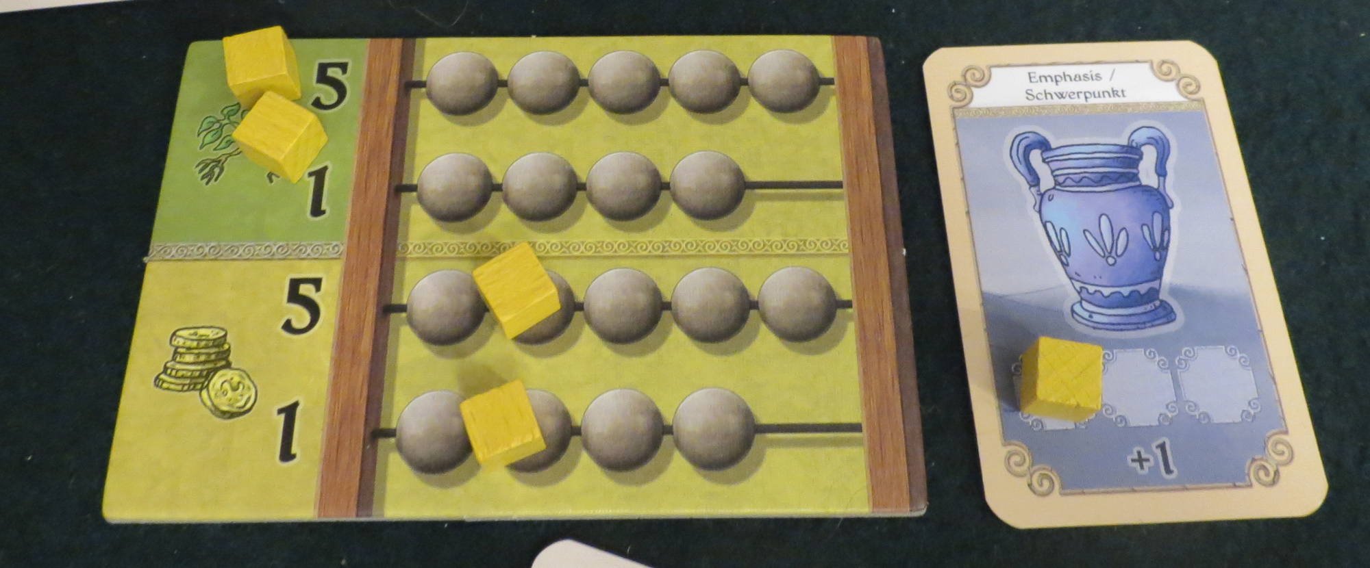 The Sands of Time is a slow game. Slow enough that it’s right there in the rules that players should hustle through their turns. With icons and bonuses pouring in from so many sources, it becomes downright sluggish as chronicles are prepared. Keeping track of everything is no easy feat. Even upon growing conversant in the game’s iconography and decision space, we often found ourselves missing important details. Someone hadn’t remembered to gather that extra resource thanks to their irrigation, or accidentally took a bump in unrest when they forgot that sanitation increased the capacity of their cities, or didn’t count their lyres properly due to an odd advance, or didn’t differentiate between the map’s shading between plains and mountain regions versus those shaded for varying player counts, or wound up one trade good short because the press of components on the board were obscuring what they thought was an icon that was actually a blank space.