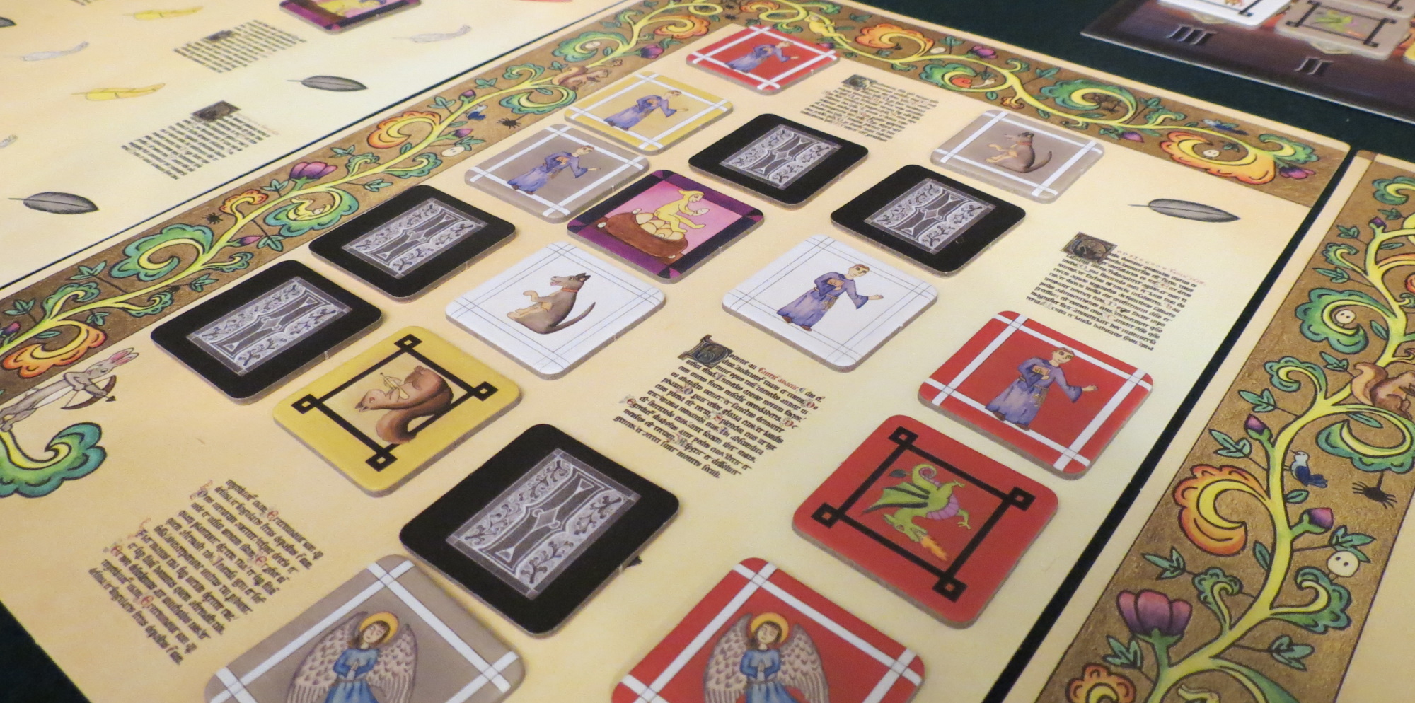 Speaking of scriptorium cards, these are the much-needed interruptions to Illumination’s usual routine. As I mentioned before, it’s possible to place an illustration over text, which can wrinkle the lay of the parchment in unexpected ways. Similar are the cards that let you shift a tile elsewhere, banish your rival’s tile to another page, or find a ritual token in the pocket of your other habit. Woe unto the monk who believes his trio of angels shall never be unseated from their thrones, for their fall is the fruit of his pride.