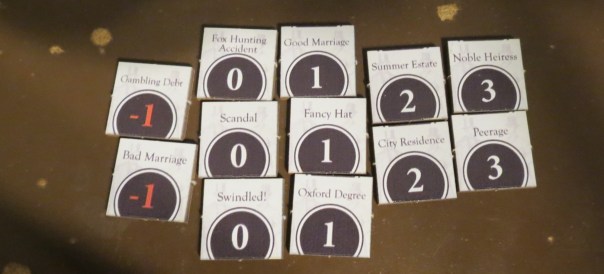 At the conclusion of a round, each family can elect to send a scion back to London — effectively, to introduce one of their young notables into polite society. Each round offers a selection of prizes, which are assigned to London’s incoming twigs depending on the relative profits of their family. The most famous is the Fancy Hat. Worth a meager one point, this is easily the prize with the sharpest bite. To think, all those addicted people, all those crates of opium, all those smugglers and unsavory connections and opium wars with casualties on both sides, and all you got was the 19th century equivalent of this lousy t-shirt. That’s only the most obvious irony. It’s also possible to return to London only to discover that none of the prizes are worth anything. Three scions enter polite society and come away with gambling debts, bad marriages, and a fox hunting accident. It’s a punchline so bitter you could choke laughing on it.